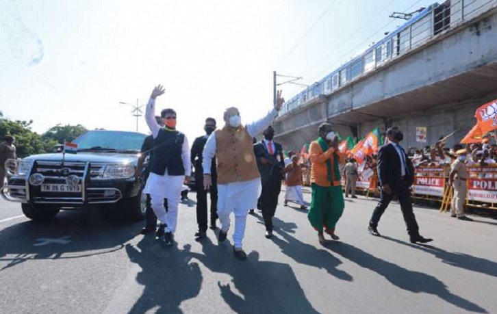 ଆଗାମୀ ନିର୍ବାଚନ ପାଇଁ ଭାଜପା ଶାସକ ଦଳ ଏଆଇଏଡିଏମ୍କେ ସହ ମେଣ୍ଟ କରିଥିବା ଜଣାପଡ଼ିଛି। ତେଣୁ ଏବେ ଭାଜପା ତାମିଲନାଡୁରେ ଲୋକଙ୍କ ବିଶ୍ୱାସ ଜିତିବାକୁ ଉଦ୍ୟମ ଚଳାଇଛି। ଶନିବାର ଚେନ୍ନାଇରେ ବିମାନମନ୍ଦରରେ ଶାହା ପହଞ୍ଚିବା ପରେ ତାଙ୍କୁ ଭାଜପା କର୍ମକର୍ତ୍ତା ସ୍ବାଗତ ଜଣାଇଥିଲେ। ରାସ୍ତାରେ କର୍ମକର୍ତ୍ତାଙ୍କ ଖୁସି ଓ ଉତ୍ସାହିତ ଦେଖି ତାଙ୍କୁ ସମ୍ମାନ ଜଣାଇବା ସହ ଶାହା କାର୍ରୁ ବାହାରି ହୋଟେଲ ପର୍ଯ୍ୟନ୍ତ ଚାଲି ଚାଲି ଯାଇଥିଲେ। ଶାହାଙ୍କ ଏଭଳି କାର୍ଯ୍ୟ ଦ୍ୱାରା ଏବେ ରାଜନୈତିକ ଉଷ୍ମତା ଦେଖାଦେଇଛି।