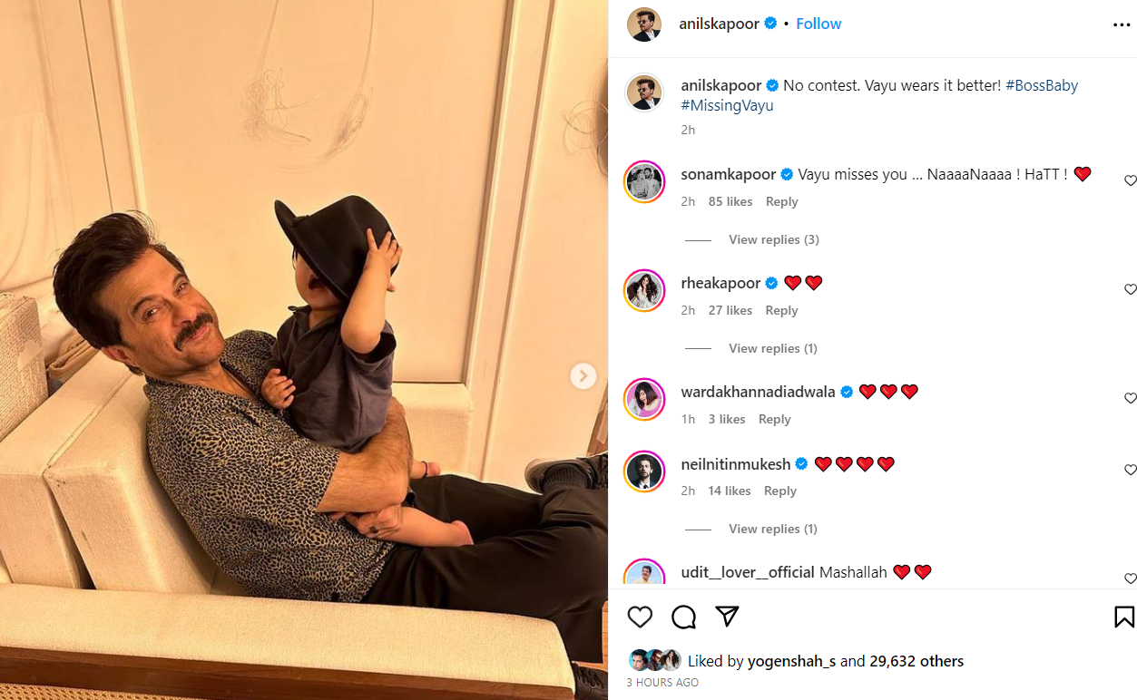 ଦ୍ୱିତୀୟ ଫଟୋରେ ଅନିଲ ବାୟୁଙ୍କୁ କୋଳରେ ଧରିଥିବାର ନଜର ଆସିଛନ୍ତି। ଏହି ସମୟରେ ସୋନମ ମଧ୍ୟ ପାଖରେ ଅଛନ୍ତି। ଏଥିରେ କ୍ୟାପଶନ ଲେଖିଛନ୍ତି, କୌଣସି ବିତର୍କ ନାହିଁ, ବାୟୁ ଏହି ଟୋପି ଭଲ ଭାବରେ ପିନ୍ଧନ୍ତି। # ବସ୍ ବାବି # ମିସିଙ୍ଗ ବାୟୁ। ବାପାଙ୍କ ପୋଷ୍ଟ ଉପରେ ମନ୍ତବ୍ୟ ଦେଇ ସୋନମ କପୁର ଲେଖିଛନ୍ତି, ଅଜା ବାୟୁ ତୁମକୁ ଏବଂ ତୁମର ଟୋପି ମଧ୍ୟ ବହୁତ ମିସ୍ କରୁଛି।