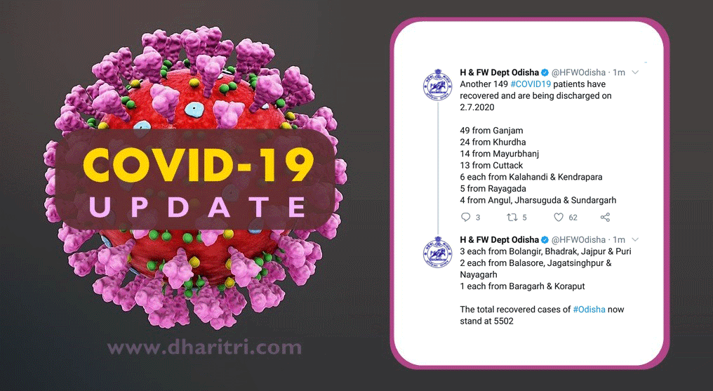 ଭୁବନେଶ୍ୱର, ୨।୭(ବ୍ୟୁରୋ): ରାଜ୍ୟରେ ଗୁରୁବାର ୧୪୯ କରୋନା ଆକ୍ରାନ୍ତ ସୁସ୍ଥ ହୋଇଛନ୍ତି। ସେମାନଙ୍କ ମଧ୍ୟରୁ ଗଞ୍ଜାମ ଜିଲାରୁ ସର୍ବାଧିକ ୪୯ଜଣ ସୁସ୍ଥ ହୋଇଛନ୍ତି। ସେହିପରି ଖୋର୍ଦ୍ଧା ୨୪, ମୟୂରଭଞ୍ଜ ୧୪, କଟକ ୧୩, କଳାହାଣ୍ଡି-କେନ୍ଦ୍ରାପଡ଼ାରୁ ୬ଜଣ ଲେଖାଏ, ରାୟଗଡ଼ା ୫, ଅନୁଗୋଳ-ଝାରସୁଗୁଡ଼ା-ସୁନ୍ଦରଗଡ଼ରୁ ୪ ଜଣ ଲେଖାଏ, ବଲାଙ୍ଗୀର-ଭଦ୍ରକ-ଯାଜପୁର-ପୁରୀରୁ ୩ଜଣ ଲେଖାଏ, ବାଲେଶ୍ୱର-ଜଗତ୍ସିଂହପୁର-ନୟାଗଡ଼ରୁ ୨ଜଣ ଲେଖାଏ, ବରଗଡ଼ ଏବଂ କେରାପୁଟରୁ ଜଣେ ଲେଖାଏ ସୁସ୍ଥ ହୋଇଛନ୍ତି। ନୂତନ ଅkାରୋଗ୍ୟଙ୍କୁ ମିଶାଇ ରାଜ୍ୟରେ ମୋଟ ସୁସ୍ଥଙ୍କ ସଂଖ୍ୟା ୫୫୦୨କୁ ବୃଦ୍ଧି ପାଇଛି। ଏ ନେଇ ରାଜ୍ୟ ସ୍ବାସ୍ଥ୍ୟ ଓ ପରିବାର କଲ୍ୟାଣ ବିଭାଗ ପକ୍ଷରୁ ସୂଚନା ମିଳିଛି।
