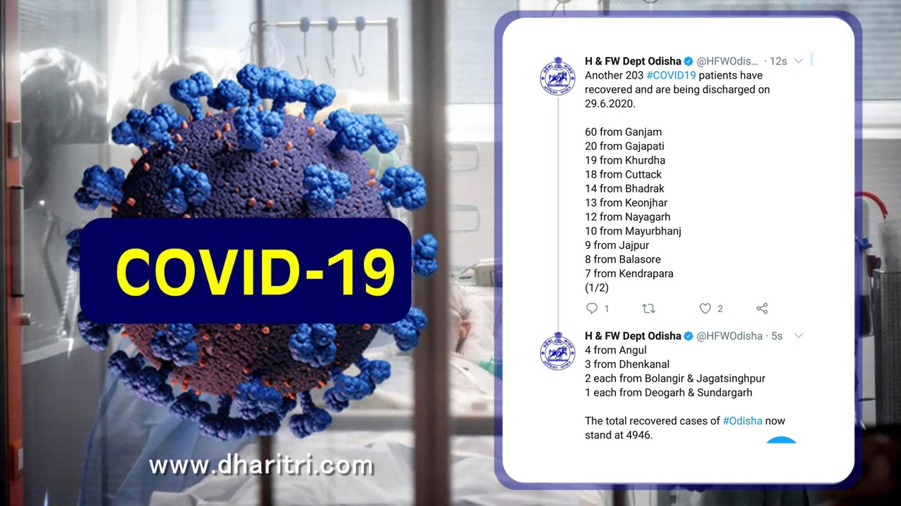 ଭୁବନେଶ୍ୱର, ୨୯।୬(ବ୍ୟୁରୋ): ରାଜ୍ୟରେ ସୋମବାର ଆଉ ୨୦୩ କରୋନା ଆକ୍ରାନ୍ତ ସୁସ୍ଥ ହୋଇଛନ୍ତି। ଫଳରେ ଏହାକୁ ମିଶାଇ ରାଜ୍ୟରେ ମୋଟ ସୁସ୍ଥଙ୍କ ସଂଖ୍ୟା ୪୯୪୬ରେ ପହଞ୍ଚିଛି। ଏ ନେଇ ରାଜ୍ୟ ସ୍ବାସ୍ଥ୍ୟ ଓ ପରିବାର କଲ୍ୟାଣ ବିବାଭ ପକ୍ଷରୁ ଟୁଇଟ୍କରି ସୂଚନା ଦିଆଯାଇଛି।