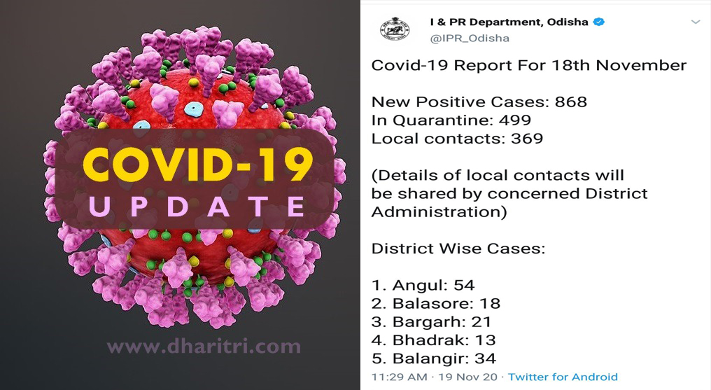 ଭୁବନେଶ୍ୱର,୧୯।୧୧(ବ୍ୟୁରୋ): ରାଜ୍ୟରେ ପୁଣି ୮୬୮ ଜଣ କରୋନା ଆକ୍ରାନ୍ତ ଚିହ୍ନଟ ହୋଇଛନ୍ତି। ସେମାନଙ୍କ ମଧ୍ୟରୁ ୪୯୯ କ୍ୱାରାଣ୍ଟାଇନ୍‌ରୁ ଚିହ୍ନଟ ହୋଇଥିବାବେଳେ ୩୬୯ଜଣ ଲୋକାଲ କେସ୍‌ ଥିବା ରାଜ୍ୟ ସୂଚନା ଏବଂ ଲୋକସମ୍ପର୍କ ବିଭାଗ ପକ୍ଷରୁ ଟୁଇଟ୍‌ ଯୋଗେ ସୂଚନା ଦିଆଯାଇଛି। ଏହାକୁ ମିଶାଇ ରାଜ୍ୟରେ ମୋଟ ୩ ଲକ୍ଷ ୧୧ ହଜାର ୭୮୮ରେ ପହଞ୍ଚିଛି। ଗୁରୁବାର ଚିହ୍ନଟ ଆକ୍ରାନ୍ତଙ୍କ ମଧ୍ୟରେ ଖୋର୍ଦ୍ଧା ଜିଲାରୁ ସର୍ବାଧିକ ୧୨୬ଜଣ ଥିବା ଜଣାପଡିଛି। ସେହିପରି କଟକ ୬୪, ମୟୁରଭଞ୍ଜ ୪୬, ବରଗଡ ୨୧, ଭଦ୍ରକ ୧୩, ବାଲେଶ୍ୱର ୧୮, ଯାଜପୁର ୩୧, ରାୟଗଡାରୁ ୭, ନବରଙ୍ଗପୁର ୧୪, କେନ୍ଦ୍ରାପଡା ୩୫, କୋରାପୁଟ ୧୨, ଜଗତସିଂହପୁର ୪୪, ଢେଙ୍କାନାଳରୁ ୧୮, ଝାରସୁଗୁଡା ୨୧, ଅନୁଗୋଳ ୫୪, ନୂଆପଡା ୪୬, ସମ୍ବଲପୁର ୧୮, ସୁନ୍ଦରଗଡ ୮୭, ସୋନପୁର ୬ ଆକ୍ରାନ୍ତ ଚିହ୍ନଟ ହୋଇଛନ୍ତି।