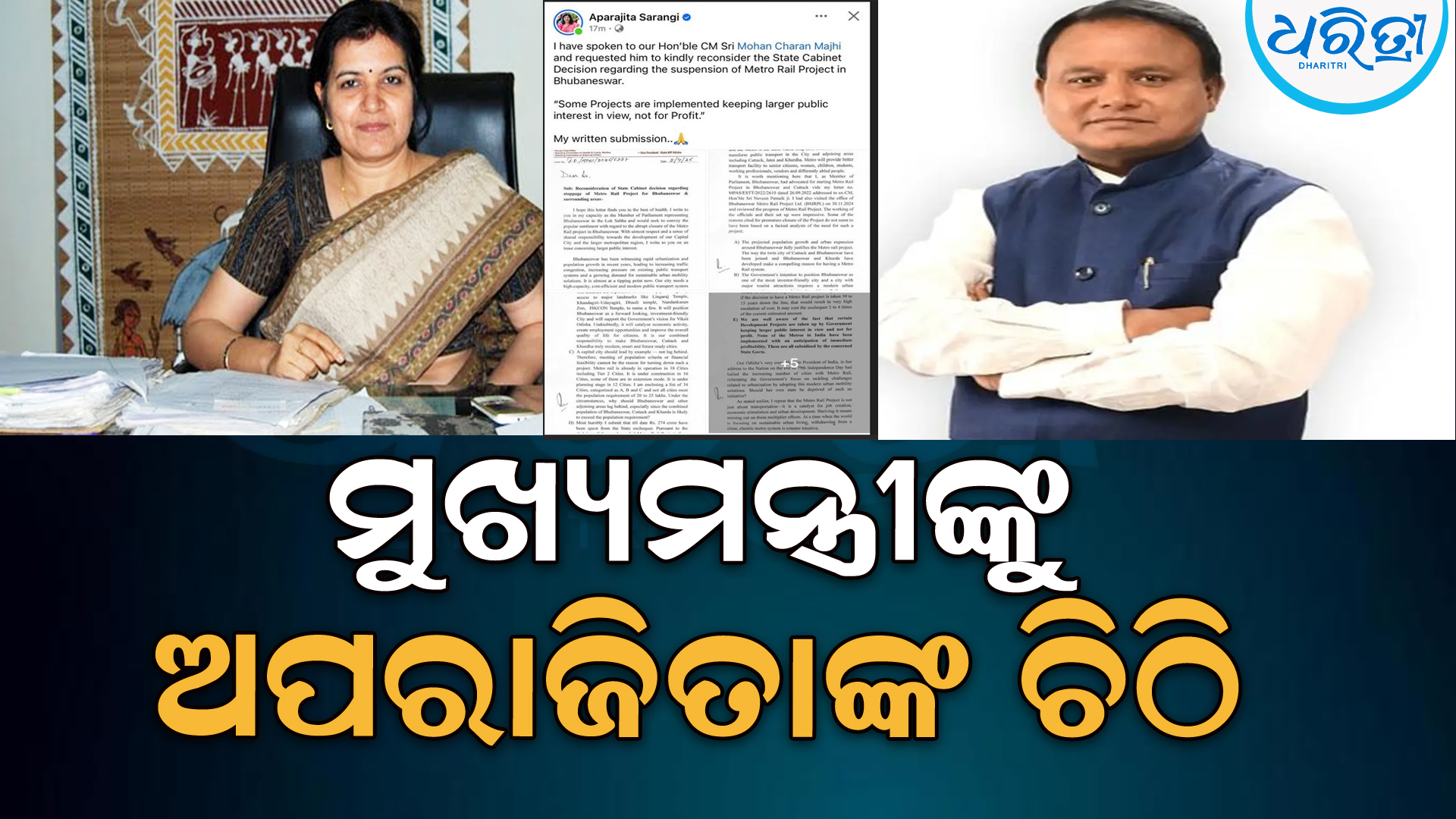 ଭୁବନେଶ୍ୱର,୧୦ା୪: ରାଜ୍ୟରେ ପୁଣି ଜୋର୍ ଧରିଛି ମେଟ୍ରୋ ପ୍ରକଳ୍ପ ରାଜନୀତି। ମେଟ୍ରୋ ପ୍ରକଳ୍ପକୁ ନେଇ ମୁଖ୍ୟମନ୍ତ୍ରୀଙ୍କୁ ଚିଠି ଲେଖିଛନ୍ତି ଏମ୍ପି ଅପରାଜିତା ଷଡ଼ଙ୍ଗୀ। ପ୍ରକଳ୍ପ ବନ୍ଦ ନିଷ୍ପତ୍ତି ଉପରେ ପୁନଃବିଚାର କରିବାକୁ ମୁଖ୍ୟମନ୍ତ୍ରୀଙ୍କୁ ଅପରାଜିତା ଏହି ଚିଠି ଲେଖିଛନ୍ତି। ଜନସଂଖ୍ୟା ବୃଦ୍ଧିକୁ ଦୃଷ୍ଟିରେ ରଖି ନିଷ୍ପତ୍ତି ପୁନଃବିଚାର କରିବାକୁ ଚିଠିରେ ଉଲ୍ଲେଖ କରିଛନ୍ତି ଅପରାଜିତା। କିଛି ପ୍ରକଳ୍ପ ଲାଭ ପାଇଁ ନୁହେଁ ବରଂ ଜନସାଧାରଣଙ୍କ ହିତ ପାଇଁ କରାଯାଏ ବୋଲି ଅପରାଜିତା ତାଙ୍କ ଚିଠିରେ ଲେଖିଛନ୍ତି।