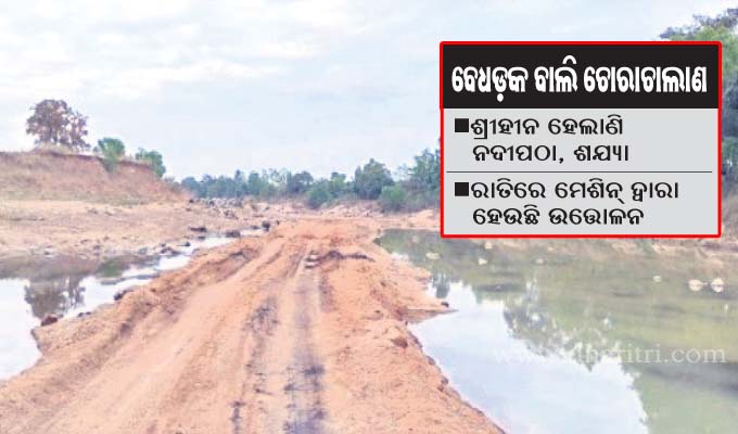 ପାଟଣା,୧୦ା୨(ସ୍ବ.ପ୍ର.): କେନ୍ଦୁଝର ଜିଲା ପାଟଣା ଓ ସାହାରପଡ଼ା ତହସିଲ ଦେଇ ପ୍ରବାହିତ ବୈତରଣୀ, କଞ୍ଝାରି, ଦେଓ ନଦୀରେ ଥିବା ଲିଜ୍ ବାଲି ଉତ୍ସ ସହ ଘାଟ ଓ ବିଭିନ୍ନ ନାଳରୁ ବେଧଡ଼କ ଭାବେ ବାଲି ଉତ୍ତୋଲନ କରାଯାଉଛି। ଲଘୁ ଖଣିଜ ଆଇନକୁ ଉଲ୍ଲଂଘନ କରି ଚୋରା ଡମ୍ପ କରି ଜିଲାର ବିଭିନ୍ନ ଅଞ୍ଚଳକୁ ବାଲି ଚୋରାଚାଲାଣ ହେଉଛି। ଚୋରାଚାଲାଣକାରୀ ମାଲା ମାଲ ହେଉଥିବା ବେଳେ ସରକାରଙ୍କ ବିପୁଳ ରାଜସ୍ବହାନି ଘଟୁଛି। ବେଆଇନ ଭାବେ ମୋଟର ବୋଟ୍ ମାଧ୍ୟମରେ ବାଲି ଉତ୍ତୋଳନ ସହ ନଦୀ ମଝିରେ କୃତ୍ରିମ ମାଟି ରାସ୍ତା ନିର୍ମାଣ କରି ଭାରିଯାନରେ ବାଲିଚାଲାଣ ହେଉଛି। ଫଳରେ ନଦୀ ଶଯ୍ୟା ପୋତି ହୋଇପଡୁଛି।