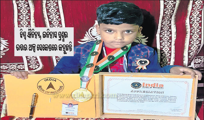 ବାଲୁଗାଁ, ୧୦।୩(ଡି.ଏନ୍.ଏ.): ବୟସ ମାତ୍ର ୫ବର୍ଷ। ହେଲେ ଏହି ବୟସରେ ପ୍ରଖର ସ୍ମରଣଶକ୍ତିର ଅଧିକାରୀ ହୋଇପାରିଛନ୍ତି ଖୋର୍ଦ୍ଧା ଜିଲାର ବିସ୍ମୟ ବାଳକ ଆଶିଷ କୁମାର ରଣସିଂହ। ଯେଉଁ ବୟସରେ ଖେଳକୁଦ କରିବା କଥା ସେହି ସମୟରେ ଜଣେ ଏହି ଶିଶୁ ସମଗ୍ର ରାଜ୍ୟ, ଦେଶ ଓ ବିଶ୍ୱର ଐତିହ୍ୟ, ଇତିହାସ ଏବଂ ଅନେକ ଗାଥା ମାତ୍ର ଅଳ୍ପ କେଇ ସେକେଣ୍ଡରେ ପ୍ରକାଶ କରି ଆଜି ଇଣ୍ଡିଆ ବୁକ୍ ଅଫ୍ ରେକର୍ଡସ୍ରେ ସ୍ଥାନ ପାଇବାରେ ସଫଳତା ଅର୍ଜନ କରିଛନ୍ତି ।