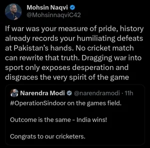 ପ୍ରଧାନମନ୍ତ୍ରୀ ମୋଦିଙ୍କ ପୋଷ୍ଟ ସମ୍ପର୍କରେ ନକଭି କହିଛନ୍ତି, ଯଦି ଯୁଦ୍ଧ ତୁମର ଗର୍ବର ମାପକାଠି, ତେବେ ଇତିହାସ ପାକିସ୍ତାନ ହାତରେ ତୁମର ଅପମାନଜନକ ପରାଜୟକୁ ପୂର୍ବରୁ ରେକର୍ଡ କରିସାରିଛି। କୌଣସି କ୍ରିକେଟ ମ୍ୟାଚ ସେହି ସତ୍ୟକୁ ବଦଳାଇ ପାରିବ ନାହିଁ। ଯୁଦ୍ଧକୁ କ୍ରୀଡାରେ ଟାଣିବା କେବଳ ହତାଶାକୁ ପ୍ରକାଶ କରେ ଏବଂ ଖେଳର ଆତ୍ମାକୁ ଅପମାନିତ କରେ।