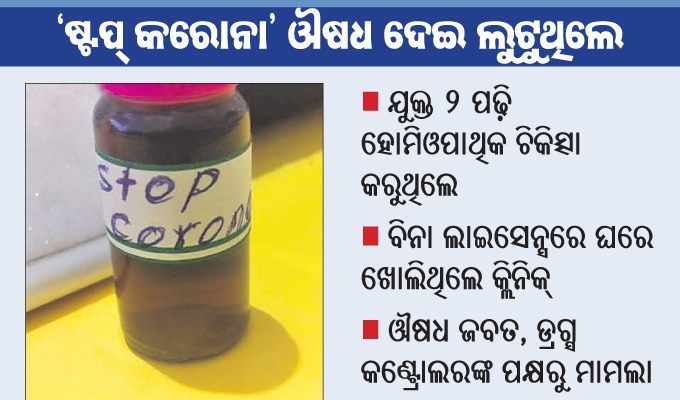 ପ୍ରକାଶ ଯେ, ସୁନ୍ଦରପଦାର କୋକିଳ ଭିଲ୍ଲାରେ ମାନସ ନିଜ ଭଡ଼ା ଘରେ ‘ଷ୍ଟପ୍ କରୋନା’ ନାମରେ ଔଷଧ ଦେଉଥିବା ଖବର ମିଳିବା ପରେ ‘ଧରିତ୍ରୀ’ ପକ୍ଷରୁ ଅନୁସନ୍ଧାନ କରାଯାଇଥିଲା। ଧରିତ୍ରୀ ପ୍ରତିନିଧି ରୋଗୀ ସାଜି ଉକ୍ତ କ୍ଲିନିକ୍ରେ ପହଞ୍ଚତ୍ ସମ୍ପୃକ୍ତ ଡାକ୍ତରଙ୍କୁ କେତେକ ଲକ୍ଷଣ କହିଥିଲେ। ଏହାପରେ ମାନସ ୨୦୦ଟଙ୍କା ନେଇ ଏକ ୧୦ ଗ୍ରାମର ପ୍ଲାଷ୍ଟିକ ବୋତଲରେ ‘ଷ୍ଟପ୍ କରୋନା’ ହାତ ଲେଖାଥିବା ତରଳ ଔଷଧ ଦେଇଥିଲେ। ଏହାକୁ ଖାଇଲେ ଜୀବନରେ କେବେ କରୋନା ପାଖ ମାଡ଼ିବ ନାହିଁ। ବହୁ ବଡ଼ ବଡ଼ ଅଧିକାରୀ ଓ ପ୍ରତିଷ୍ଠିତ ଗଣମାଧ୍ୟମ କର୍ମଚାରୀ ଏହାକୁ ଖାଇ ଭଲ ହୋଇଛନ୍ତି। ଆଗାମୀ ଦିନରେ ଏଠାରେ ଏକ କରୋନା ହସ୍ପିଟାଲ ଖୋଲାଯିବ ବୋଲି କହିଥିଲେ। ତେବେ ତାଙ୍କର ଔଷଧ ଓ କ୍ଲିନିକ୍ର ବୈଧତା ଜାଣିବା ପାଇଁ ଆମ ପ୍ରତିନିଧି ଏ ସମ୍ପର୍କରେ ଡ୍ରଗ୍ସ କଣ୍ଟ୍ରୋଲରଙ୍କ ସହ ଯୋଗାଯୋଗ କରିଥିଲେ। ହେଲେ ସେପରି କାହାକୁ ଅନୁମତି ଦିଆଯାଇ ନ ଥିବା କହିଥିଲେ। ଗୁରୁବାର ପୂର୍ବାହ୍ନରେ ଡ୍ରଗ୍ସ ଇନ୍ସପେକ୍ଟର ଚନ୍ଦନ ଗିରି, ତୁଷାର ରଞ୍ଜନ ପାଣିଗ୍ରାହୀ, ପି.କେ. ଲେଙ୍କା, ସୁଦର୍ଶନ ବିଶ୍ୱାଳଙ୍କ ନେତୃତ୍ୱରେ ଏକ ଟିମ୍ ମାନସଙ୍କ ଘରେ ଚଢ଼ାଉ କରିଥିଲା। ସେତେବେଳେ ସେଠାରେ ୫ଜଣ ରୋଗୀଙ୍କ ଚିକିତ୍ସା ଚାଲିଥିଲା। ପ୍ରଥମେ ମାନସ ଡ୍ରଗ୍ସ ଅଧିକାରୀଙ୍କୁ ଦେଖି ହଡ଼ବଡ଼େଇ ଯାଇଥିଲେ। ଔଷଧ ବିକ୍ରି ଓ ଚିକିତ୍ସା ପାଇଁ ଲାଇସେନ୍ସ ମାଗିବାରୁ ସେ କିଛି ଦେଖାଇପାରି ନ ଥିଲେ। ମାନସ କହିଥିଲେ, ସେ ଯୁକ୍ତ ୨ ବିଜ୍ଞାନ ପଢିଛନ୍ତି। ଗତବର୍ଷ କରୋନା ଆରମ୍ଭ ହେବାପରେ ଏହି ହୋମିଓପାଥିକ କ୍ଲିନିକ୍ ଖୋଲି ନିଜେ ‘ଷ୍ଟପ୍ କରୋନା’ ଔଷଧ ତିଆରି କରି ଲୋକଙ୍କୁ ଦେଉଛନ୍ତି। ଏଥିସହ କ୍ୟାନ୍ସସର, ଡାଇବେଟିସ ଆଦି ବିଭିନ୍ନ ପ୍ରକାର ରୋଗର ଓଷଧ ନିଜେ ତିଆରି କରୁଥିବା ସେ ଡ୍ରଗ୍ସ ଅଧିକାରୀଙ୍କ ଆଗରେ ସ୍ବୀକାର କରିଥିଲେ।