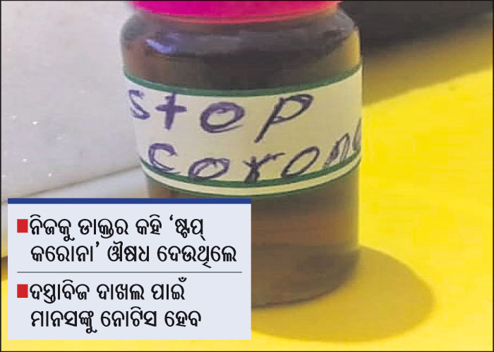 ସୁନ୍ଦରପଦାର କୋକିଳ ଭିଲ୍ଲାରେ ମାନସ ନିଜ ଭଡା ଘରେ ‘ଷ୍ଟପ୍ କରୋନା’ ନାମରେ ଔଷଧ ଦେଉଥିବା ଖବର ମିଳିବା ପରେ ‘ଧରିତ୍ରୀ’ ପକ୍ଷରୁ ଅନୁସନ୍ଧାନ କରାଯାଇଥିଲା। ଆମ ପ୍ରତିନିଧି ରୋଗୀ ସାଜି ଉକ୍ତ କ୍ଲିନିକ୍ରେ ପହଞ୍ଚତ୍ ସମ୍ପୃକ୍ତ ଡାକ୍ତରଙ୍କୁ କେତେକ ଲକ୍ଷଣ କହିଥିଲେ। ଏହାପରେ ମାନସ ୨୦୦ଟଙ୍କା ନେଇ ଏକ ୧୦ ଗ୍ରାମର ପ୍ଲାଷ୍ଟିକ ବୋତଲରେ ‘ଷ୍ଟପ୍ କରୋନା’ ହାତ ଲେଖାଥିବା ତରଳ ଔଷଧ ଦେଇଥିଲେ। ଆଗାମୀ ଦିନରେ ଏଠାରେ ଏକ କରୋନା ହସ୍ପିଟାଲ ହେବ ବୋଲି ମାନସ କହିଥିଲେ। ତେବେ ତାଙ୍କର ଔଷଧ ଓ କ୍ଲିନିକ୍ର ବୈଧତା ଜାଣିବା ପାଇଁ ଆମ ପ୍ରତିନିଧି ଡ୍ରଗ୍ସ କଣ୍ଟ୍ରୋଲରଙ୍କ ସହ ଯୋଗାଯୋଗ କରିଥିଲେ। ଡ୍ରଗ୍ସ କଣ୍ଟ୍ରୋଲରଙ୍କ ପକ୍ଷରୁ ଏକ ଟିମ୍ ମାନସ ରହୁଥିବା ଘରେ ଥିବା କ୍ଲିନିକ୍ରେ ଚଢାଉ କରିଥିଲା।