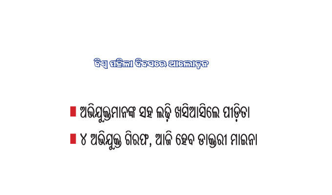 କାଳିଆପାଣି,୯।୩(ଡି.ଏନ୍.ଏ.): ସୋମବାର ବିଶ୍ୱ ମହିଳା ଦିବସ ସମାରୋହ ଖୁବ୍ ଧୁମ୍ଧାମରେ ପାଳନ ହେଉଥିବା ବେଳେ ସୁକିନ୍ଦା ନିକଟ ଭିମଟଙ୍ଗର ଗ୍ରାମ ନିକଟ ବୁଦୁବୁଦିଆ ଜଙ୍ଗଲରେ ଏକ ଅଭାବନୀୟ ଘଟଣା ଘଟିଛି। ଜଣେ ଆଦିବାସୀ ନାବାଳିକାଙ୍କୁ ୪ଜଣ ଯୁବକ ଗଣବଳାତ୍କାର ଉଦ୍ୟମ କରିଛନ୍ତି। ଏ ସଂକ୍ରାନ୍ତରେ କାଳିଆପାଣି ଥାନାରେ ଅଭିଯୋଗ ହୋଇଛି। ସମ୍ପୃକ୍ତ ଯୁବକମାନଙ୍କୁ ପୋଲିସ ଗିରଫ କରିଛି। ସେମାନେ ହେଲେ ଟାଟାହଟିଂ ତାରେଣୀ ମାର୍କେଟରେ ରହୁଥିବା ଧାମନଗର ଥାନା ଦଶରଥପୁର ଗ୍ରାମର ସନ୍ତୋଷ କୁମାର ପୃଷ୍ଟି (୩୧) ଓ ରବି ନାଏକ(୨୦), ମଲ୍ଲାରସାହିର ସିଲୁ ମହାନ୍ତ(୨୦), କାଟେପୁର୍ତ୍ତି ନଗରର ସତ୍ୟବ୍ରତ ବେହେରା(୨୦)।