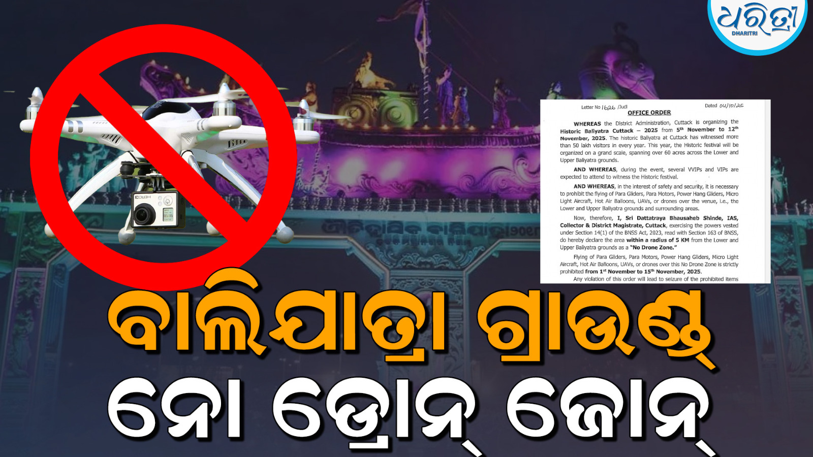 କଟକ,୮ା୧୦: ବାଲିଯାତ୍ରା ଗ୍ରାଉଣ୍ଡ ‘ନୋ ଡ୍ରୋନ୍ ଜୋନ୍’ ଘୋଷଣା କରି ନିର୍ଦ୍ଦେଶନାମା ଜାରି କରିଛନ୍ତି କଟକ ଜିଲାପାଳ। ନଭେମ୍ବର ୧ରୁ ୧୫ ପର୍ଯ୍ୟନ୍ତ ‘ନୋ ଡ୍ରୋନ୍ ଜୋନ୍’ ଘୋଷଣା କରାଯାଇଛି। ବାଲିଯାତ୍ରା ଗ୍ରାଉଣ୍ଡଠାରୁ ୫ କିମି ପରିଧି ପାଇଁ କଟକଣା ଜାରି ହୋଇଛି। ପାରା ଗ୍ଲାଇଡର୍ସ, ପାରା ମୋଟର୍ସ, ପାଓ୍ବାର ହ୍ୟାଙ୍ଗ ଗ୍ଲାଇଡର୍ସ ଉଡ଼ାଣ ମନା। ମାଇକ୍ରୋ ଲାଇଟ୍ ଏୟାରକ୍ରାଫ୍ଟ, ହଟ୍ ଏୟାର ବେଲୁନ୍, UAV, ଡ୍ରୋନ୍ ମନା। ବାଲିଯାତ୍ରାକୁ ପ୍ରାୟ ୫୦ ଲକ୍ଷ ଲୋକ ଆସିବାକୁ ଥିବାରୁ ସୁରକ୍ଷା ପାଇଁ ପଦକ୍ଷେପ ନିଆଯାଇଛି। ନଭେମ୍ବର ୫ରୁ ୧୨ ପର୍ଯ୍ୟନ୍ତ ଐତିହାସିକ ବାଲିଯାତ୍ରା ଆୟୋଜିତ ହେବ।