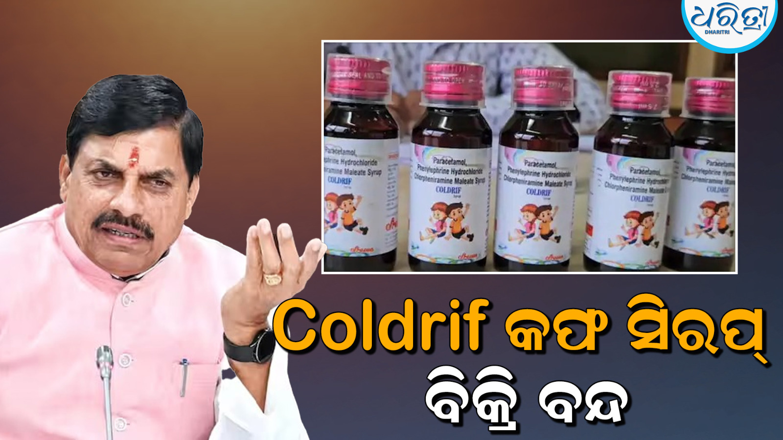 ଭୋପାଳ,୪।୧୦: ମଧ୍ୟପ୍ରଦେଶର ଛିନ୍ଦୱାଡାରେ କଫ ସିରପ୍ ଖାଇ ୯ ଜଣ ଶିଶୁଙ୍କ ମୃତ୍ୟୁପରେ, ରାଜ୍ୟ ସରକାର ଏକ ବଡ଼ ପଦକ୍ଷେପ ନେଇଛନ୍ତି। ମୁଖ୍ୟମନ୍ତ୍ରୀ ମୋହନ ଯାଦବ ସାରା ରାଜ୍ୟରେ Coldrif କଫ ସିରପ ବିକ୍ରୟ ଉପରେ ନିଷେଧ କରିଛନ୍ତି। ଏହି ଘଟଣା ସମଗ୍ର ରାଜ୍ୟକୁ ଚକିତ କରିଛି। ସରକାର ତୁରନ୍ତ କାର୍ଯ୍ୟାନୁଷ୍ଠାନ ଗ୍ରହଣ କରିଛନ୍ତି। ସିରପ ଏବଂ ଏହାର ଉତ୍ପାଦ ପ୍ରସ୍ତୁତକାରୀ କମ୍ପାନୀ ବିରୋଧରେ ତଦନ୍ତ ଆରମ୍ଭ କରିଛନ୍ତି।