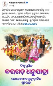 ନିଜ ସୋସିଆଲ ମିଡ଼ିଆ ଆକାଉଣ୍ଟରେ ଶୁଭେଚ୍ଛା ଜଣାଇ ନବୀନ ଲେଖିଛନ୍ତି,’ବିଶ୍ୱ ପ୍ରସିଦ୍ଧ ବରଗଡ଼ ଧନୁଯାତ୍ରା ଆରମ୍ଭ ଅବସରରେ ସଭିଙ୍କୁ ମୋର ଶୁଭେଚ୍ଛା ଜଣାଉଛି। ପୃଥିବୀର ସର୍ବବୃହତ ମୁକ୍ତାକାଶ ରଙ୍ଗମଞ୍ଚରେ ଆୟୋଜିତ ଧନୁଯାତ୍ରା ଆମ ଗରିମାମୟ ସଂସ୍କୃତି ଓ ଆଧ୍ୟାତ୍ମିକ ଚେତନାର ଅନନ୍ୟ ନିଦର୍ଶନ। ଆସନ୍ତୁ ଧନୁଯାତ୍ରାରେ ସାମିଲ ହୋଇ ଏହାକୁ ବିଶ୍ୱପ୍ରସାରୀ କରିବା।”