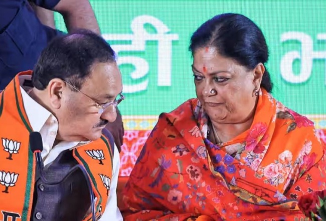 ଜୟପୁର,୭।୧୨: ରାଜସ୍ଥାନରେ ମୁଖ୍ୟମନ୍ତ୍ରୀ ପଦକୁ ନେଇ ସସପେନ୍ସ ମଧ୍ୟରେ ଗୁରୁବାର ପୂର୍ବତନ ମୁଖ୍ୟମନ୍ତ୍ରୀ ବସୁନ୍ଧରା ରାଜେ ସିନ୍ଧିଆ ଦିଲ୍ଲୀରେ ଭାଜପା ରାଷ୍ଟ୍ରୀୟ ଅଧ୍ୟକ୍ଷ ଜେପି ନଡ୍ଡାଙ୍କୁ ଭେଟିଥିଲେ। ସେ ତାଙ୍କ ପୁଅ ତଥା ଏମପି ଦୁଶ୍ୟନ୍ତ ସିଂଙ୍କ ସହ ନଡ୍ଡାଙ୍କ ବାସଭବନରେ ପହଞ୍ଚିଥିଲେ। ବୈଠକ ପରେ ବସୁନ୍ଧରା ରାଜେ ହସି ହସି କାର ଭିତରୁ ମିଡିଆ ଆଡକୁ ହାତ ବୁଲାଇଲେ।