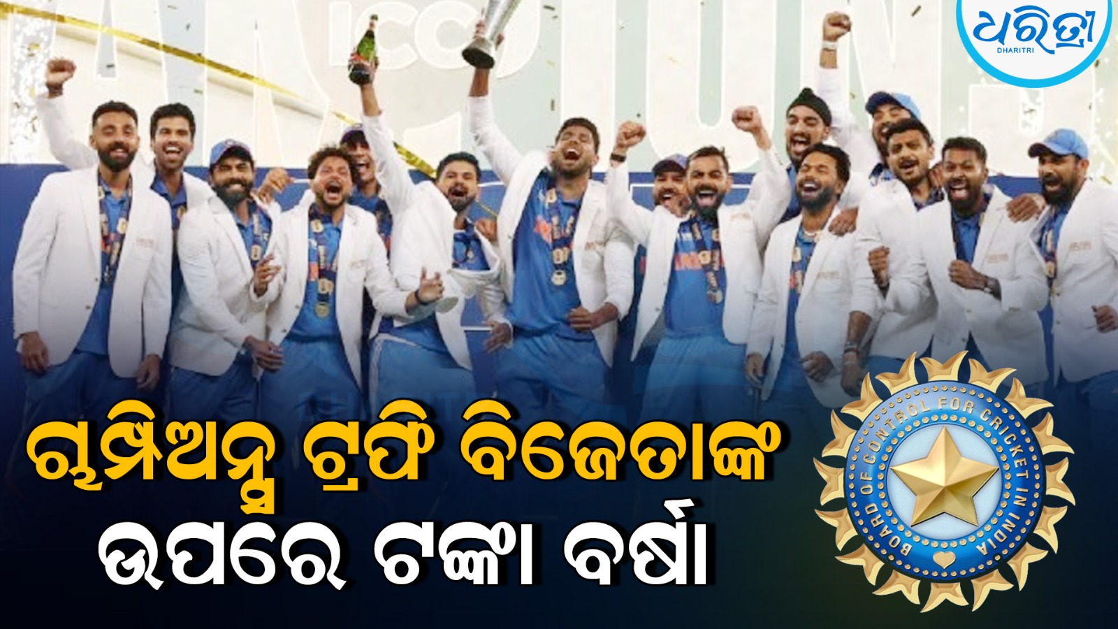 ମୁମ୍ବାଇ,୨୦।୩: ଆଇସିସି ଚାମ୍ପିଅନ୍ସ ଟ୍ରଫି ୨୦୨୫ ରେ ବିଜୟୀ ହେବା ପରେ ଭାରତୀୟ କ୍ରିକେଟ୍ ନିୟନ୍ତ୍ରଣ ବୋର୍ଡ (BCCI) ଗୁରୁବାର ରୋହିତ ଶର୍ମାଙ୍କ ନେତୃତ୍ୱାଧୀନ ଭାରତୀୟ ୟୁନିଟ୍ ପାଇଁ ୫୮ କୋଟି ଟଙ୍କାର ଏକ ବଡ଼ ନଗଦ ପୁରସ୍କାର ଘୋଷଣା କରିଛି।