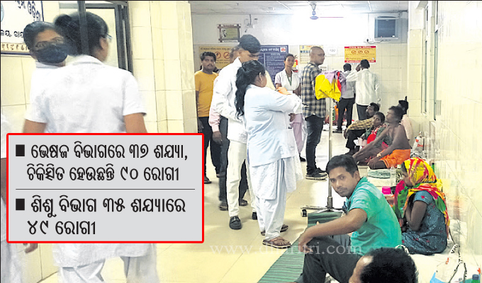 ଜିଲା ମୁଖ୍ୟ ଚିକିତ୍ସାଳୟରେ ଗତ ଏକ ସପ୍ତାହ ହେଲାଣି ବିଭିନ୍ନ ରୋଗୀ ଆସି ଆଡମିଟ ହେଉଥିବା ବେଳେ ଶଯ୍ୟା ଅଭାବରୁ ବାରଣ୍ଡାରେ ଶୋଇ ଚିକିତ୍ସିତ ହେଉଛନ୍ତି। ଶିଶୁ ଚିକିତ୍ସା ବିଭାଗରେ ରବିବାର ୪୯ ଶିଶୁ ରୋଗୀ ରହିଥିଲେ। ସେଥିରେ ପ୍ରାୟ ୨୫ ଜଣ ମ୍ୟାଲେରିଆ ରୋଗରେ ଆକ୍ରାନ୍ତ ଥିବା ଜଣାପଡ଼ିଛି। ତେବେ ଦୈନିକ ୮ରୁ ୧୦ ଶିଶୁ ମ୍ୟାଲେରିଆରେ ଆକ୍ରାନ୍ତ ହୋଇ ଜିଲା ମୁଖ୍ୟ ଚିକିତ୍ସାଳୟକୁ ଆସିଥିବା ଜଣାପଡ଼ିଛି। ତେବେ ସବୁଠୁ ବିପର୍ଯ୍ୟସ୍ତ ହୋଇପଡ଼ିଛି ଭେଷଜ ବିଭାଗ। ସେଠାରେ ୩୭ଟି ଶଯ୍ୟା ରହିଥିବା ବେଳେ ରହିବାର ୯୦ରୁ ଊର୍ଦ୍ଧ୍ୱ ରୋଗୀ ଆଡ଼ମିଟ୍ ହୋଇଥିବା ଜଣାପଡ଼ିଛି। ସେମାନଙ୍କ ମଧ୍ୟରୁ ପ୍ରାୟ ୪୦ ଜଣ ମ୍ୟାଲେରିଆ ଆକ୍ରାନ୍ତ ରହିଥିବା ଜଣାପଡ଼ିଛି। ଆବଶ୍ୟକ ବେଡ୍ ନ ଥିବାରୁ ସେମାନେ ବିଭାଗର ବାରଣ୍ଡାରେ ଶୋଇ ଚିକିତ୍ସିତ ହେଉଛନ୍ତି। ସଂକ୍ରମିତ ୱର୍ଡ୍ରେ ୧୦ ଶଯ୍ୟା ବ୍ୟବସ୍ଥା ରହିଥିବା ବେଳେ ଝାଡ଼ାବାନ୍ତି ଆକ୍ରାନ୍ତ ହୋଇ ୧୦ଜଣ ରୋଗୀ ରହିଥିବା ଜଣାପଡ଼ିଛି। ବର୍ଷାଦିନେ ଏହି ରୋଗ ଅଧିକା ବ୍ୟାପିବାର ଆଶଙ୍କା ରହିଥିବା ବେଳେ ଆବଶ୍ୟକ ସୁବିଧା ନାହିଁ। ସେହିଭଳି ପ୍ରସୂତି ବିଭାଗରେ ୪୫ ଶଯ୍ୟା, ଏସଏନସିୟୁରେ ୨୪, ଏନ୍ଆରସିରେ ୧୫, କେମୋଥେରାପିରେ ୪, ଚକ୍ଷୁ ବିଭାଗରେ ୨୦ ଏବଂ ଆଇସୋଲେଶନ ୱାର୍ଡ଼ରେ ୧୨ ଶଯ୍ୟା ବ୍ୟବସ୍ଥା ରହିଛି। ମଡିକାଲରେ ୨୨୯ ଶଯ୍ୟା ବ୍ୟବସ୍ଥା ରହିଥିବା ବେଳେ ୧୪୯ଟି ଅନୁମୋଦିତ ହୋଇଛି। କିନ୍ତୁ ରୋଗୀ ସଂଖ୍ୟା ଦିନକୁ ପ୍ରାୟ ୩ ଶହରୁ ଊର୍ଦ୍ଧ୍ୱ ରହୁଥିବା ଜଣାପଡ଼ିଛି। ଫଳରେ ରୋଗୀ ବାଧ୍ୟ ହୋଇ ବାରଣ୍ଡାରେ ଶୋଇ ଚିକିତ୍ସା ହେବା ସହ ସାଲାଇନ, ଇଞ୍ଜେକ୍ସନ ନେଉଥିବା ଦେଖିବାକୁ ମଳୁଛି।