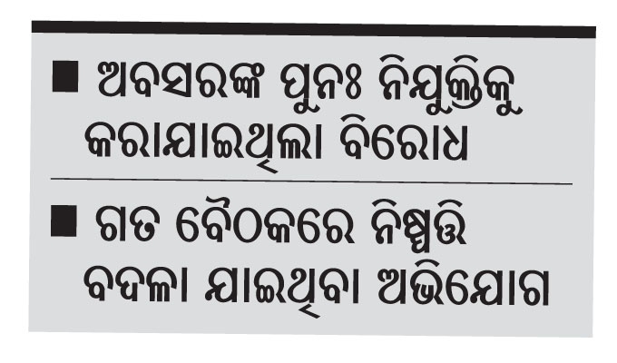 ଅଗଷ୍ଟ ମାସ ବୈଠକରେ ଏମ୍ପି ଚନ୍ଦ୍ରଶେଖର ସାହୁ, ବିଧାୟକ ବିକ୍ରମ ପଣ୍ଡା ଉପସ୍ଥିତ ଥିଲେ। ମେୟର ସଂଘମିତ୍ରା ଦଳେଇଙ୍କ ଅଧ୍ୟକ୍ଷତାରେ ହୋଇଥିବା କର୍ପୋରେଟର ବୈଠକର ପ୍ରୋସିଡିଂ ନଭେମ୍ବର ଶେଷ ସପ୍ତାହରେ ଜନ ପ୍ରତିନିଧିମାନଙ୍କୁ ଦିଆଯାଇଛି। ଆବଶ୍ୟକସ୍ଥଳେ ଏବଂ ଅଫିସ କାର୍ଯ୍ୟ ସୂଚାରୁ ରୂପେ ସମ୍ପାଦନା କରିବା ନିମନ୍ତେ ସରକାରଙ୍କ ନିୟମ ଓ ସର୍ତ୍ତାବଳୀ ଅନୁସାରେ ଅବସର ନେଇଥିବା କର୍ମଚାରୀଙ୍କୁ ପୁନଃ ନିଯୁକ୍ତି ଦେବା ଲାଗି ମେୟର ଓ କମିଶନରଙ୍କୁ କ୍ଷମତା ପ୍ରଦାନ କରାଯାଇଥିବା ପ୍ରୋସିଡିଂରେ ଦର୍ଶାଯାଇଛି। ଏହାକୁ ନେଇ କେତେକ କର୍ପୋରେଟର ପ୍ରତିକ୍ରିୟା ପ୍ରକାଶ କରିଛନ୍ତି। ଅଗଷ୍ଟ ୨୬ ବୈଠକରେ ଏହି ନିଷ୍ପତ୍ତି ନିଆଯାଇନଥିବା ଅଭିଯୋଗ କରିଛନ୍ତି।