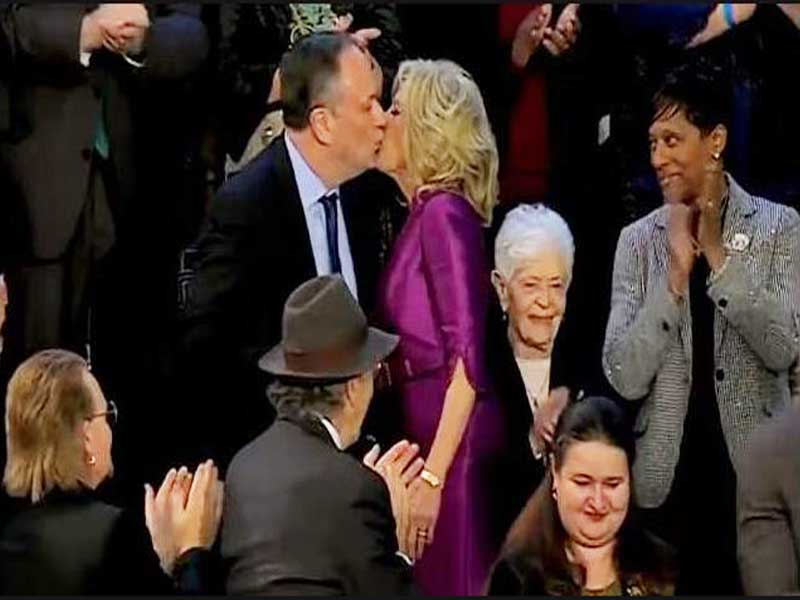 ପ୍ରକୃତରେ, ସମସ୍ତ ସଦସ୍ୟ ବାଇଡେନଙ୍କ ଭାଷଣ ଶୁଣିବା ପାଇଁ ହଲରେ ବସିଥିଲେ। ସଭାରେ ଆମେରିକାର ରାଷ୍ଟ୍ରପତି ଜୋ ବାଇଡେନଙ୍କ ସ୍ତ୍ରୀ ଆମେରିକାର ପ୍ରଥମ ଲେଡି ଜିଲ ବାଇଡେନ ଏବଂ ଉପରାଷ୍ଟ୍ରପତି କମଲା ହାରିସଙ୍କ ସ୍ବାମୀ ଡଗ ଏମହାଫ ସାମିଲ ହୋଇ ଥିଲେ। ଦୁହେଁ ପରସ୍ପର ପାଖରେ ବସିଥିଲେ। ବାଇଡେନଙ୍କ ଭାଷଣ ଆରମ୍ଭ ହେବା ପୂର୍ବରୁ ଜିଲ ବାଇଡେନ ହଲ ଭିତରକୁ ଯାଇ ଡଗ ଏମହାଫଙ୍କ ନିକଟରେ ପହଞ୍ଚି ତାଙ୍କୁ ଚୁମ୍ବନ ଦେଇଥିଲେ। ବର୍ତ୍ତମାନ ଏହାର ଭିଡିଓ ଏବଂ ଫଟୋ ଭାଇରାଲ ହେବାରେ ଲାଗିଛି। ୟୁଜରମାନେ ଏହାକୁ ନେଇ ଭିନ୍ନ ଭିନ୍ନ ପ୍ରତିକ୍ରିୟା ଦେବାରେ ଲାଗିଛନ୍ତି ।