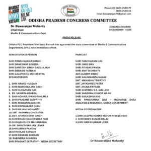 ବିଶେଷଭାବେ ରାଜ୍ୟ କଂଗ୍ରେସ ମୁଖପାତ୍ର ସ୍ତରରେ ପରିବର୍ତ୍ତନ ହୋଇଛି। ମୁଖପାତ୍ର ତାଲିକାରେ ବରିଷ୍ଠ ୫ଜଣ ନେତା ସ୍ଥାନ ପାଇଛନ୍ତିି। ସେମାନେ ହେଲେ ପଞ୍ଚାନନ କାନୁନଗୋ, ଗଣେଶ୍ୱର ବେହେରା, ସନ୍ତୋଷ ସିଂ ସାଲୁଜା, ଦେବାଶିଷ ପଟ୍ଟନାୟକ ଲଲାଟେନ୍ଦୁ ମହାପାତ୍ର। ଏହାବାଦ୍ ଅନ୍ୟ ୧୮ ଜଣ ନେତାଙ୍କୁ ମୁଖପାତ୍ର ତାଲିକାରେ ସାମିଲ୍ କରିଛି ଓଡିଶା କଂଗ୍ରେସ। ଏଥିସହ ନୂଆ ଟିମରେ ୧୨ ଜଣ ପ୍ୟାନେଲିଷ୍ଟଙ୍କୁ ନିଯୁକ୍ତ କରାଯାଇଛି।
