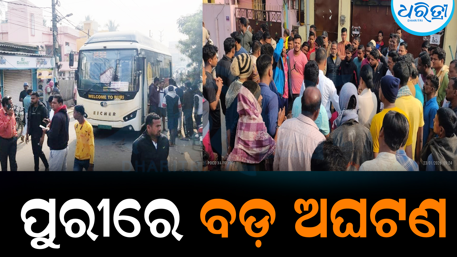 ପୁରୀ,୨୩।୧: ସରସ୍ବତୀ ପୂଜା ଅବସରରେ ପୁରୀରେ ଏକ ବଡ ଅଘଟଣ ଘଟିଛି। ଜଗନ୍ନାଥ ବସ ଧକ୍କାରେ ବୃଦ୍ଧା ଆହତ ହୋଇଥିବା ପ୍ରାଥମିକ ସୂଚନାରୁ ଜଣାପଡିଛି । ଗୁରୁତର ଅବସ୍ଥାରେ ବୃଦ୍ଧାଙ୍କୁ ଘଟଣାସ୍ଥଳରୁ ଉଦ୍ଧାର କରି ଚିକିତ୍ସା ନିମନ୍ତେ ସଦର ମୁଖ୍ୟ ଚିକିତ୍ସାଳୟରେ ଭର୍ତ୍ତି କରାଯାଇଛି । ନବକଳେବର ରୋଡରେ ଦୁର୍ଘଟଣା ଘଟିଛି । ଦୁର୍ଘଟଣାକୁ ନେଇ ସ୍ଥାନୀୟ ଅଞ୍ଚଳରେ ଉତ୍ତେଜନା ଦେଖା ଦେଇଥିବାବେଳେ ଉତ୍ତ୍ୟକ୍ତ ସ୍ଥାନୀୟ ଲୋକ ବସକୁ ରୋକିଛନ୍ତି। ଯାହାକୁ ନେଇ ଘଟଣାସ୍ଥଳରେ ଉତ୍ତେଜନା ଦେଖା ଯାଇଛି। ଖବର ପାଇ ଘଟଣାସ୍ଥଳରେ କୁମ୍ଭାରପଡା ଥାନା ପୋଲିସ ପହଞ୍ଚି ଲୋକଙ୍କୁ ବୁଝାସୁଝା କରିବା ସହ ବସକୁ ଜବତ କରିଥିବା ସୂଚନା ମିଳିଛି । ତେବେ ଆହତ ବୃଦ୍ଧାଙ୍କ ପରିଚୟ ମଳିନାହିଁ ।