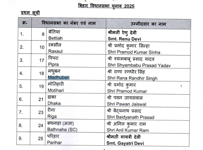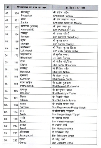 ନୂଆଦିଲ୍ଲୀ,୧୪।୧୦: ଭାରତୀୟ ଜନତା ପାର୍ଟି ମଙ୍ଗଳବାର ବିହାର ନିର୍ବାଚନ ପାଇଁ ପ୍ରଥମ ତାଲିକା ପ୍ରକାଶ କରିଛି। ତାଲିକା ଅନୁଯାୟୀ ନନ୍ଦ କିଶୋର ଯାଦବଙ୍କ ଟିକେଟ ଦିଆଯାଇନାହିଁ। ଏହି ତାଲିକାରେ ମୋଟ ୭୧ ଜଣ ପ୍ରାର୍ଥୀ ନାମିତ ହୋଇଛନ୍ତି। ଏନଡିଏ ଆସନ ବଣ୍ଟନ ଚୁକ୍ତି ପରେ ଭାଜପା ୧୦୧ଟି ଆସନ ପାଇଛି। ଦ୍ୱିତୀୟ ଆସନରେ ଅବଶିଷ୍ଟ ଆସନ ପାଇଁ ପ୍ରାର୍ଥୀ ଘୋଷଣା କରାଯିବ।