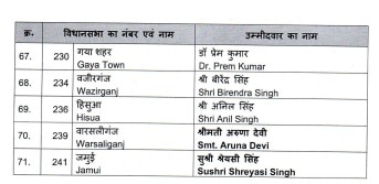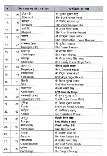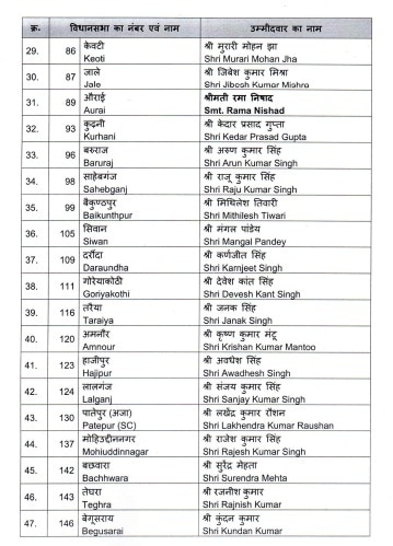 ନନ୍ଦ କିଶୋର ଯାଦବଙ୍କ ବ୍ୟତୀତ, ରିଗାରୁ ମନ୍ତ୍ରୀ ମୋତିଲାଲ ପ୍ରସାଦଙ୍କ ଟିକେଟ କଟାଯାଇଛି। ଆଉରାଇରୁ ରାମସୁରତ ରାୟଙ୍କ ଟିକେଟ କଟାଯାଇଛି। ସିୱାନରୁ ବିଧାୟକ ତଥା ସ୍ବାସ୍ଥ୍ୟମନ୍ତ୍ରୀ ମଙ୍ଗଳ ପାଣ୍ଡେଙ୍କୁ ପ୍ରାର୍ଥୀ କରାଯାଇଛି।