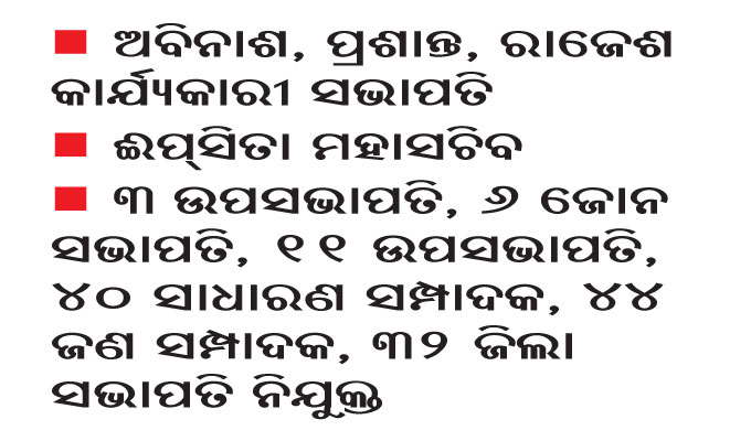 ଭୁବନେଶ୍ୱର,୨୬।୯(ବ୍ୟୁରୋ): ବିଜୁ ଯୁବ ଜନତା ଦଳ ପରେ ବିଜୁ ଛାତ୍ର ଜନତା ଦଳର ପୁନର୍ଗଠନ କରାଯାଇଛି। ବିଜେଡି ସଭାପତି ନବୀନ ପଟ୍ଟନାୟକଙ୍କ ଅନୁମୋଦନ କ୍ରମେ ବିଜୁ ଛାତ୍ର ଜନତା ଦଳର ନୂତନ ରାଜ୍ୟ କର୍ମକର୍ତ୍ତା ଓ ଜିଲା ସଭାପତିମାନଙ୍କୁ ନିଯୁକ୍ତି ଦିଆଯାଇଛି। ବିଜୁ ଜନତା ଦଳର ସାଧାରଣ ସମ୍ପାଦକ (ଛାତ୍ର ବ୍ୟାପାର) ବ୍ୟୋମକେଶ ରାୟ ଏକ ପ୍ରେସ ବିଜ୍ଞପ୍ତ ଜରିଆରେ ଏହି ସୂଚନା ଦେଇଛନ୍ତି। ପ୍ରକାଶିତ ବିଜ୍ଞପ୍ତି ଅନୁଯାୟୀ ବିଜୁ ଛାତ୍ର ଜନତା ଦଳର କାର୍ଯ୍ୟକାରୀ ସଭାପତି ଭାବେ ଅବିନାଶ ଠାକୁର, ପ୍ରଶାନ୍ତ ପଣ୍ଡା ଏବଂ ରାଜେଶ ରାଜ ସ୍ବାଇଁଙ୍କୁ ନିଯୁକ୍ତି ଦିଆଯାଇଥିବା ବେଳେ ଈପ୍ସିତା ସାହୁଙ୍କୁ ସେକ୍ରେଟାରୀ ଜେନେରାଲ (ମହାସଚିବ) ଏବଂ ବରିଷ୍ଠ ଉପସଭାପତି ଭାବେ ଅଜିତ୍ ବେହେରା, ବିଶ୍ୱ ପ୍ରତାପ ସାହୁ ଏବଂ ସ୍ବାଗତିକା ମହାନ୍ତିଙ୍କୁ ନିଯୁକ୍ତି ଦିଆଯାଇଛି।