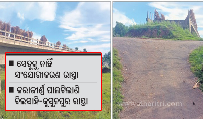 ପ୍ରୀତିପୁର,୩୧ା୧୦(ଡି.ଏନ.ଏ.): କେନ୍ଦ୍ର ଓ ରାଜ୍ୟ ସରକାର ବିଭିନ୍ନ ଯୋଜନାରେ ରାସ୍ତା ଓ ବିଜୁ ସେତୁ ନିର୍ମାଣ କରୁଛନ୍ତି। ଏଥିଲାଗି ରାଜକୋଷରୁ ଅର୍ଥ ଖର୍ଚ୍ଚ ହେଉଥିବା ବେଳେ ଲୋକମାନଙ୍କ କାମରେ ଲାଗୁନାହିଁ। ଫଳରେ ଲୋକମାନେ ବହୁ ଅସୁବିଧାରେ ସମ୍ମୁଖୀନ ହେଉଛନ୍ତି। ଏଭଳି ଦେଖିବାକୁ ମିଳିଛି, ଯାଜପୁର ଜିଲା ବିଞ୍ଝାରପୁର ଗ୍ରାମ୍ୟ ଉନ୍ନୟନ ବିଭାଗ ଅନ୍ତର୍ଗତ ବିଲସାହି-କୁସୁନପୁର ପ୍ରଧାନମନ୍ତ୍ରୀ ସଡକ ଯୋଜନା ଅଧୀନ କୁସୁନପୁର ନିକଟସ୍ଥ ନୂଆମାହାରା ନଦୀ ଉପରେ ନିର୍ମିତ ବିଜୁ ସେତୁ କ୍ଷେତ୍ରରେ। ସେତୁକୁ ଉଭୟପାର୍ଶ୍ୱରୁ ସଂଯୋଗୀକରଣ ଲାଗି ରାସ୍ତା ନିର୍ମାଣ ହୋଇନାହିଁ। ସେତୁ ନିର୍ମାଣ ଶେଷ ହୋଇ ମଧ୍ୟ ଲୋକଙ୍କ କାମରେ ଆସିପାରୁନାହିଁ।