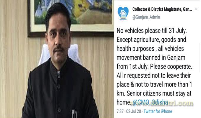 ଛତ୍ରପୁର, ୨।୬(ଡି.ଏନ୍.ଏ.) ଗଞ୍ଜାମ ଜିଲାରେ ଜୁଲାଇ ୩୧ ପର୍ଯ୍ୟନ୍ତ ବାଇକ ଚଳାଚଳକୁ ସମ୍ପୂର୍ଣ୍ଣ ନିଷେଧ କରାଯାଇଛି। କେବଳ ମେଡିକାଲ, କୃଷି କାର୍ଯ୍ୟ ପାଇଁ ପରିଚୟପତ୍ର ଦେଖାଇ ବାଇକ ଚଳାଚଳ କରିହେବ। ଏ ନେଇ ଗୁରୁବାର ଜିଲାପାଳ ବିଜୟ ଅମୃତା କୁଲାଙ୍ଗେ ଟୁଇଟ୍କରି ସୂଚନା ଦେଇଛନ୍ତି। ୧ କି.ମି. ମଧ୍ୟରେ ଚାଲି ଚାଲି ଯାଇ ଅତ୍ୟାବଶ୍ୟକୀୟ ସାମଗ୍ରୀ ଆଣିପାରିବେ। ତେବେ ବରିଷ୍ଠ ନାଗରିକମାନେ ଘରୁ ବାହାରିବେ ନାହିଁ। ଅପରାହ୍ନ ୪ ଟାରୁ ପରଦିନ ସକାଳ ୬ଟା ପର୍ଯ୍ୟନ୍ତ ସମ୍ପୂର୍ଣ୍ଣ ଶଟ୍ଡାଉନ ରହିବ ବୋଲି ଜିଲାପାଳ କହିଛନ୍ତି।