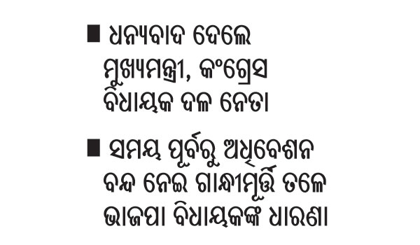 ଏହାପରେ ବାଚସ୍ପତି ୧୦ଟି କମିଟି ସଦସ୍ୟ ଏବଂ ଅଧ୍ୟକ୍ଷଙ୍କ ନଁା ଘୋଷଣା କରିଥିଲେ।a ସେହିପରି ବାଚସ୍ପତିଙ୍କ ଅଧ୍ୟକ୍ଷତାରେ ଗଠିତ ବିଭିନ୍ନ କମିଟି ସମ୍ପର୍କରେ ଘୋଷଣା କରାଯାଇଥିଲା। ପୋଲାଭରମ୍ ପ୍ରକଳ୍ପ ଲାଗି ଓଡ଼ିଶାର ବହୁ କ୍ଷତି ହୋଇଥିବାବେଳେ ଏନେଇ ଏକ କମିଟି ଗଠନ ହୋଇଛି। ଉକ୍ତ କମିଟି ପ୍ରଧାନମନ୍ତ୍ରୀଙ୍କୁ ସାକ୍ଷାତ୍ କରିବାକୁ ପ୍ରସ୍ତାବ ପାରିତ ହୋଇଛି। ସେହିପରି ସୀମା ସମସ୍ୟା ନେଇ ମଧ୍ୟ ଏକ କମିଟି ଗଠନ ହୋଇଛି। ଏମ୍ଏସ୍ପି ବୃଦ୍ଧି ପ୍ରସଙ୍ଗରେ ଗଠିତ କମିଟିର ସଦସ୍ୟମାନେ ମଧ୍ୟ ପ୍ରଧାନମନ୍ତ୍ରୀଙ୍କୁ ଭେଟିବା ଲାଗି ଆଲୋଚନା କରିବେ। ଏହାପରେ ସରକାରୀ ଦଳ ମୁଖ୍ୟ ସଚେତକ ପ୍ରଶାନ୍ତ ମୁଦୁଲି ସବୁ ଦଳର ସଦସ୍ୟ ଦେଢ଼ମାସ ହେବ ନିଜ ନିର୍ବାଚନମଣ୍ଡଳୀକୁ ଯାଇପାରୁ ନ ଥିବାବେଳେ ଗୁରୁତ୍ୱପୂର୍ଣ୍ଣ ବିଷୟ ଆଲୋଚନା ସରିଥିବାରୁ ଏବଂ ବଜେଟ୍କୁ ମଞ୍ଜୁରୀ ମିଳିସାରିଥିବାରୁ ଗୃହ ଅନିର୍ଦ୍ଦିଷ୍ଟ କାଳ ପର୍ଯ୍ୟନ୍ତ ମୁଲତବୀ କରିବାକୁ ପ୍ରସ୍ତାବ ଦେଇଥିଲେ। ପଦ୍ମନାଭ ବେହେରା, ଶଶିଭୂଷଣ ବେହେରା, ଭୂପିନ୍ଦର ସିଂହ, ଦେବୀ ପ୍ରସାଦ ମିଶ୍ର, ଅରୁଣ ସାହୁ, ନିରଞ୍ଜନ ପୂଜାରୀ ଏହି ପ୍ରସ୍ତାବକୁ ସମର୍ଥନ କରିଥିଲେ। ଏହାପରେ ବିରୋଧୀ ସଦସ୍ୟଙ୍କୁ ବୁଝାଇ ଗୃହକୁ ଆଣିବା ଲାଗି ଖାଦ୍ୟ ଯୋଗାଣ ଓ ଖାଉଟି କଲ୍ୟାଣ ମନ୍ତ୍ରୀ ଏବଂ ସରକାରୀ ଦଳ ମୁଖ୍ୟ ସଚେତକଙ୍କୁ ବାଚସ୍ପତି ନିର୍ଦ୍ଦେଶ ଦେଇଥିଲେ। କଂଗ୍ରେସ ସଦସ୍ୟମାନେ ଗୃହକୁ ଫେରିଥିବାବେଳେ ଭାଜପା ସଦସ୍ୟମାନେ ରାଜି ହୋଇ ନ ଥିଲେ। ଏହାପରେ ମୁଖ୍ୟମନ୍ତ୍ରୀ ନବୀନ ପଟ୍ଟନାୟକ ବଜେଟ ଅଧିବେଶନ ସୁରୁଖୁରୁରେ ଚାଲିଥିବାରୁ ସମସ୍ତଙ୍କୁ ଧନ୍ୟବାଦ ଜଣାଇଥିଲେ। କଂଗ୍ରେସ ବିଧାୟକ ଦଳ ନେତା ନରସିଂହ ମିଶ୍ର ମଧ୍ୟ ଗୃହ କାର୍ଯ୍ୟ ସୁରୁଖୁରୁରେ ଚାଲିଥିବା ଯୋଗୁ ଧନ୍ୟବାଦ ଦେଇଥିଲେ। ଏହାପରେ ଗୃହରେ ସବୁ ସଦସ୍ୟ ବନ୍ଦେ ଉତ୍କଳ ଜନନୀ ଗାନ କରିଥିଲେ। ବାଚସ୍ପତି ଗୃହକୁ ଅନିର୍ଦ୍ଦିଷ୍ଟ କାଳ ପର୍ଯ୍ୟନ୍ତ ମୁଲତବୀ ଘୋଷଣା କରିଥିଲେ। ସମୟ ପୂର୍ବରୁ ଗୁରୁତ୍ୱପୂର୍ଣ୍ଣ ପ୍ରସଙ୍ଗ ବିଷୟରେ ଆଲୋଚନା ନ କରି ଏବଂ ୩ଟି ବିଲ୍ ପ୍ରତ୍ୟାହାର କରିନିଆଯିବାକୁ ବିରୋଧ କରି ବିଧାନସଭା ଗାନ୍ଧୀମୂର୍ତ୍ତି ତଳେ ୧୫ ମିନିଟ୍ ଲାଗି ଭାଜପା ବିଧାୟକମାନେ ଧାରଣାରେ ବସିଥିଲେ।