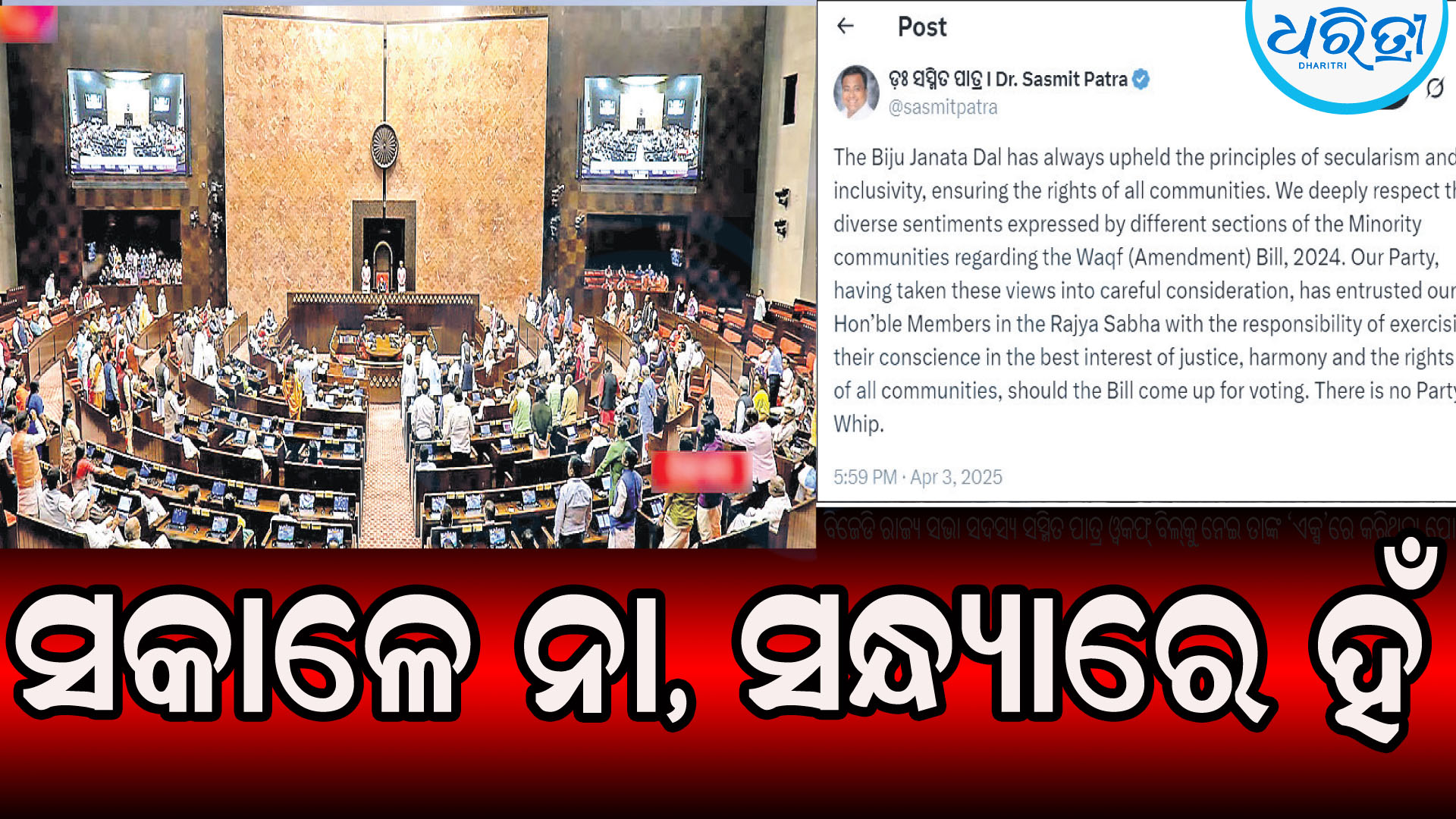 ସୂଚନାଯୋଗ୍ୟ, ଲୋକ ସଭାରେ ବୁଧବାର ବିଳମ୍ବିତ ରାତିରେ ଓ୍ବକଫ୍ ବିଲ୍ ପାରିତ ହୋଇଯାଇଛି। ୧୨ ଘଣ୍ଟା ଧରି ଏହି ବିଲ୍ ଉପରେ ଆଲୋଚନା ହେବା ପରେ ଭୋଟ କରାଯାଇଥିଲା। ବିଲ୍ ସପକ୍ଷରେ ୨୮୮ଟି ଭୋଟ୍ ପଡ଼ିଥିବା ବେଳେ ବିରୋଧରେ ୨୩୨ଟି ଭୋଟ ପଡ଼ିଥିଲା। ଅର୍ଥାତ୍ ଲୋକ ସଭାରେ ଶାସକ ଏବଂ ବିରୋଧୀଙ୍କ ଭିତରେ ଦୂରତା ମାତ୍ର ୫୬କୁ ଖସି ଆସିଲାଣି। ହେଲେ ଏଭଳି ସମୟରେ ବିଜେଡି ଲୋକ ସଭାରେ ସମ୍ପୂର୍ଣ୍ଣ ଜିରୋ ହୋଇସାରିଛି। ଏ ପର୍ଯ୍ୟନ୍ତ ବିଜେଡି ମୁଣ୍ଡରେ ବୁଦ୍ଧି ଉଦୟ ହୋଇନାହିଁ ବୋଲି ଚର୍ଚ୍ଚା ହେଉଛି। କିଛିଦିନ ତଳେ ସସ୍ମିତ ଏହା ଉପରେ କହିଥିଲେ, ବିଲ୍ ଉପରେ ବିରୋଧୀଙ୍କ ପ୍ରସ୍ତାବକୁ ଗୃହରେ ଗ୍ରହଣ କରାଯାଉଛି ନା ନାହିଁ ତା’ ଉପରେ ବିଚାରକରିବା ପରେ କ’ଣ ନିଷ୍ପତ୍ତି ହେବ ତାହା ସ୍ଥିର କରାଯିବ। ହେଲେ ଗୁରୁବାର ସସ୍ମିତ ଉଲ୍ଲେଖ କରିଛନ୍ତି, ଏହି ବିଲ୍କୁ ବିବେକ ଅନୁସାରେ ଭୋଟ ଦେବାକୁ ନିଷ୍ପତ୍ତି ହୋଇଛି। ଏହା ଉପରେ କୌଣସି ହୁଇପ୍ ନାହିଁ ବୋଲି ସେ ସ୍ପଷ୍ଟ କରିଛନ୍ତି। ବିଜେଡିର କେତେଜଣ ରାଜ୍ୟ ସଭା ସଦସ୍ୟଙ୍କ ସହ ଧରିତ୍ରୀ ପକ୍ଷରୁ ଯୋଗାଯୋଗ କରିବାରୁ ସେମାନେ କହିଥିଲେ, ସସ୍ମିତ ମନଇଚ୍ଛା ଏହା କହିଥିବେ। ଦଳରୁ ପଚାରି ସେମାନେ ପ୍ରତିକ୍ରିୟା ରଖିବେ ବୋଲି କହିଥିଲେ। ହେଲେ ପରବର୍ତ୍ତୀ ସମୟରେ ଆଉ ଟେଲିଫୋନ୍ ଉଠାଇଲେ ନାହିଁ। ଅର୍ଥାତ୍ ସେମାନଙ୍କ ଭିତରେ କୌଣସି ନିଷ୍ପତ୍ତି ହୋଇନାହିଁ ବୋଲି ଏହି କଥାରୁ ବୁଝାପଡୁଛି। ସସ୍ମିତ ନିଜ ମନରୁ ଏହି ନିଷ୍ପତ୍ତି ବାହାରକୁ ଛାଡ଼ି ନ ଥିବା କଥା ଜାଣିବା ପରେ ପ୍ରତିକ୍ରିୟା ରଖିବାକୁ କହୁଥିବା ବିଜେଡିର ଅନ୍ୟ ଏମ୍ପିମାନେ ଚୁପ୍ହୋଇଯିବାକୁ ବାଧ୍ୟ ହୋଇଛନ୍ତି।