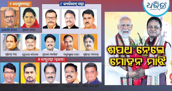 ଭୁବନେଶ୍ୱର, ୧୩।୬ (ସୁନିତ୍ ମିଶ୍ର)ଓଡ଼ିଶାରେ ବୁଧବାରଠାରୁ ଆରମ୍ଭ ହୋଇଛି ଭାଜପା ଶାସନ। ଏହାସହ ରାଜ୍ୟରେ ‘ଡବଲ ଇଞ୍ଜିନ ସରକାର’ ପାଇଁ ଭାଜପା ଦେଇଥିବା ଆହ୍ବାନ ସଫଳ ହୋଇଛି। କେନ୍ଦୁଝର ବିଧାୟକ ମୋହନ ଚରଣ ମାଝି ରାଜ୍ୟର ୧୫ତମ ମୁଖ୍ୟମନ୍ତ୍ରୀ ଭାବେ ଶପଥ ଗ୍ରହଣ କରିଛନ୍ତି। ତାଙ୍କ ସହ କନକ ବର୍ଦ୍ଧନ ସିଂଦେଓ ଏବଂ ପ୍ରଭାତୀ ପରିଡ଼ା ଉପମୁଖ୍ୟମନ୍ତ୍ରୀ ରୂପେ ଶପଥ ନେଇଛନ୍ତି। ଏଥିସହ ୮ ଜଣ ବିଧାୟକ ସୁରେଶ ପୂଜାରୀ, ରବି ନାରାୟଣ ନାଏକ, ନିତ୍ୟାନନ୍ଦ ଗଣ୍ଡ, କୃଷ୍ଣଚନ୍ଦ୍ର ପାତ୍ର, ପୃଥ୍ବୀରାଜ ହରିଚନ୍ଦନ, ମୁକେଶ ମହାଲିଙ୍ଗ, ବିଭୂତି ଭୂଷଣ ଜେନା, କୃଷ୍ଣଚନ୍ଦ୍ର ମହାପାତ୍ର କ୍ୟାବିନେଟ୍ ମନ୍ତ୍ରୀ ଭାବେ ଏବଂ ୫ ଜଣ ବିଧାୟକ ଗଣେଶ ରାମ ସିଂ ଖୁଣ୍ଟିଆ, ସୂର୍ଯ୍ୟବଂଶୀ ସୂରଜ, ପ୍ରଦୀପ ବଳସାମନ୍ତ, ଗୋକୁଳାନନ୍ଦ ମଲିକ ଓ ସମ୍ପଦ ଚନ୍ଦ୍ର ସ୍ବାଇଁ ସ୍ବାଧୀନ ରାଷ୍ଟ୍ରମନ୍ତ୍ରୀ ଭାବେ ଶପଥ ପାଠ କରିଛନ୍ତି।