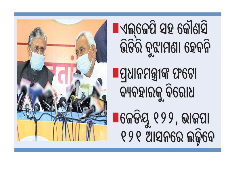 ପାଟନା,୭।୧୦: ବିହାର ବିଧାନସଭା ନିର୍ବାଚନ ପୂର୍ବରୁ ଏନ୍ଡିଏରେ ଦେଖାଦେଇଥିବା ଫାଟ କ୍ରମଶଃ ମଳିନ ପଡ଼ିଯାଇଛି। ଚିରାଗ ପାଶ୍ୱାନଙ୍କ ଲୋକ ଜନଶକ୍ତି ପାର୍ଟି(ଏଲ୍ଜେପି) ଜେଡିୟୁକୁ ବିରୋଧ କରିବ ଓ ଏନ୍ଡିଏ ସହ ରହିବ ବୋଲି କହି ଦ୍ୱନ୍ଦ୍ୱ ସୃଷ୍ଟି କରିଥିବାବେଳେ ଭାଜପା ଅକଳରେ ପଡ଼ିଥିଲା। ଏବେ ଏହା ଦୂର ହୋଇଛି। ପ୍ରଦେଶ ଭାଜପା ମୁଖ୍ୟ ସଞ୍ଜୟ ଜୈଶଓ୍ବାଲ ପକ୍ଷରୁ ନିଜର ନୀତିଗତି ସ୍ପଷ୍ଟ କରାଯିବା ସହ ଏଲ୍ଜେପି ସହ କୌଣସି ଭିତିରି ବୁଝାମଣା କରାଯିବନି ବୋଲି ମଙ୍ଗଳବାର ସ୍ପଷ୍ଟ କରିଛି। ଏଥିସହ ଜେଡିୟୁ ନେତା ତଥା ମୁଖ୍ୟମନ୍ତ୍ରୀ ନୀତୀଶ୍ କୁମାର ପ୍ରତି ଦୃଢ଼ ଆସ୍ଥା ପ୍ରକଟ କରିଛି। ନୀତୀଶ୍ଙ୍କ ନେତୃତ୍ୱରେ ଏନ୍ଡିଏ ବିହାର ନିର୍ବାଚନ ଲଢ଼ିବ ବୋଲି ସ୍ପଷ୍ଟ କରାଯାଇଛି। ଏଲ୍ଜେପି ପ୍ରଧାନମନ୍ତ୍ରୀ ନରେନ୍ଦ୍ର ମୋଦିଙ୍କ କୌଣସି ଫଟୋ ପ୍ରଚାରବେଳେ ବ୍ୟବହାର କରିପାରିବ ନାହିଁ ବୋଲି ଜୈଶଓ୍ବାଲ କହିଛନ୍ତି।