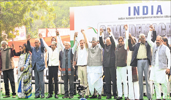 ନୂଆଦିଲ୍ଲୀ,୨୩ା୧୨: ପାର୍ଲାମେଣ୍ଟର ଶୀତ ଅଧିବେଶନ କାଳରେ ଉଭୟ ଗୃହରୁ ୧୪୬ ଜଣ ଏମ୍ପିଙ୍କୁ ନିଲମ୍ବନ କରାଯିବା ପ୍ରତିବାଦରେ ବିରୋଧୀ ଇଣ୍ଡିଆ ବ୍ଲକ୍ର ନେତାମାନେ ନୂଆଦିଲ୍ଲୀର ଯନ୍ତରମନ୍ତରଠାରେ ବିକ୍ଷୋଭ ପ୍ରଦର୍ଶନ କରିଛନ୍ତି। ଗଣତନ୍ତ୍ରର ସୁରକ୍ଷା ପାଇଁ ସେମାନେ ପ୍ରତିଜ୍ଞା ନେବା ସହ ୨୦୨୪ ଲୋକ ସଭା ନିର୍ବାଚନରେ ଭାଜପାକୁ ପରାଜିତ କରିବା ପାଇଁ ଆହ୍ବାନ ଦେଇଛନ୍ତି। ଶାସକ ଦଳ ବିରୋଧୀମାନଙ୍କ ସ୍ବରକୁ ଚାପିଦେଇଥିବା ବିରୋଧୀ ନେତାମାନେ ଅଭିଯୋଗ କରିଛନ୍ତି। କଂଗ୍ରେସ ଅଧ୍ୟକ୍ଷ ମଲ୍ଲିକାର୍ଜୁନ ଖାର୍ଗେଙ୍କ ନେତୃତ୍ୱରେ ଅନୁଷ୍ଠିତ ବିକ୍ଷୋଭରେ ଦଳର ନେତା ରାହୁଲ ଗାନ୍ଧୀ, ଏନ୍ସିପି ମୁଖ୍ୟ ଶରଦ ପାଓ୍ବାରଙ୍କ ସମେତ ଅନ୍ୟ ବିରୋଧୀ ଦଳ ନେତାମାନେ ସାମିଲ ହୋଇଥିଲେ। ବର୍ତ୍ତମାନର ସରକାରରେ ଗଣତନ୍ତ୍ର ପ୍ରତି ବିପଦ ସୃଷ୍ଟି ହୋଇଥିବାରୁ ଆମକୁ ଏକାଠି ହେବାକୁ ପଡ଼ିବ ବୋଲି ଖାର୍ଗେ କହିଥିଲେ। ସମସ୍ତେ ଏକାଠି ହେଲେ ମୋଦି ସରକାର କିଛି କରିପାରିବ ନାହିଁ ବୋଲି ସେ କହିଥିଲେ। ଏମ୍ପିମାନଙ୍କୁ ନିଲମ୍ବନ କରି ସରକାର ବିରୋଧୀଙ୍କ ମୁହଁ ବନ୍ଦ କରିଦେବାକୁ ଉଦ୍ୟମ କରୁଛନ୍ତି। ତେବେ ଗଣତନ୍ତ୍ରର ସୁରକ୍ଷା ପାଇଁ ଯେକୌଣସି ମୂଲ୍ୟ ଦେବାକୁ ଆମେ ପ୍ରସ୍ତୁତ ଅଛୁ ବୋଲି ଏନ୍ସିପି ଅଧ୍ୟକ୍ଷ ଶରଦ ପାଓ୍ବାର କହିଥିଲେ।