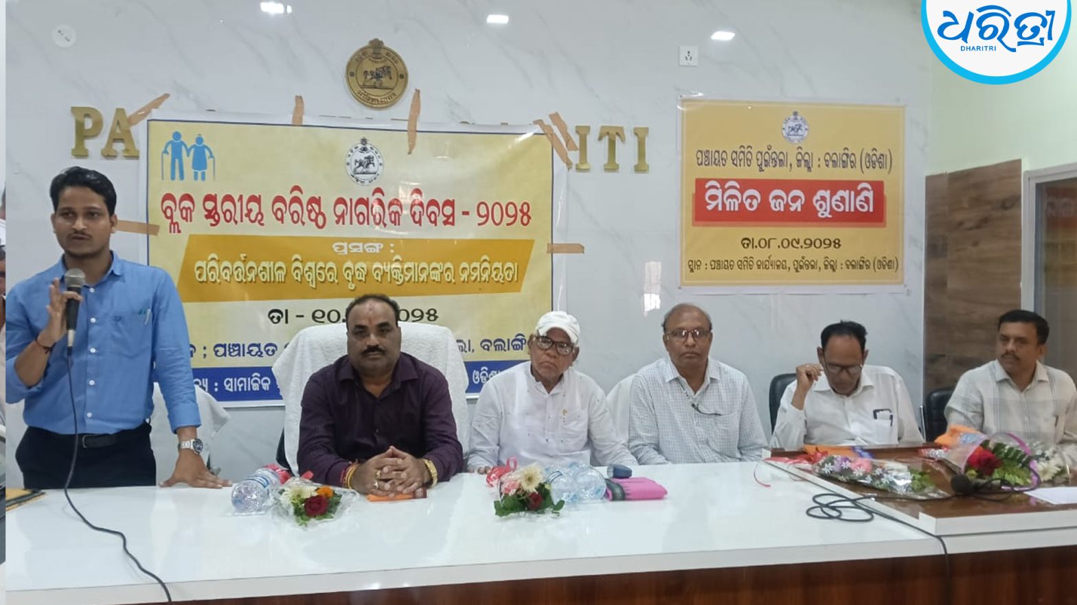 ବଲାଙ୍ଗୀର,୧୦।୧୦:(ସୁନିଲ କୁମାର ମହାନ୍ତି):ବଲାଙ୍ଗୀର ଜିଲାର ପୁଇଁନ୍ତଲା ପଞ୍ଚାୟତ ସମିତି କାର୍ଯ୍ୟାଳୟ ସମ୍ମିଳନୀ କକ୍ଷଠାରେ ବ୍ଲକ ପ୍ରଶାସନ ପକ୍ଷରୁ ବ୍ଲକ ସ୍ତରୀୟ ବରିଷ୍ଠ ନାଗରିକ ଦିବସ ପାଳିତ ହୋଇଯାଇଛି । ଗୋଷ୍ଠୀ ଉନ୍ନୟନ ଅଧିକାରୀ ଅମରେନ୍ଦ୍ର ସ୍ବାଇଁଙ୍କ ସଭାପତିତ୍ୱରେ ଅନୁଷ୍ଠିତ ଦିବସରେ ମୁଖ୍ୟଅତିଥି ଭାବରେ ବ୍ଲକ ଅଧ୍ୟକ୍ଷ ସରୋଜ କୁମାର ପଧାନ ଓ ସମ୍ମାନିତ ଅତିଥି ଭାବରେ ଜିଲା ପରିଷଦ ସଭ୍ୟ ଶିବଦତ୍ତ ମିଶ୍ର , କୁମରମଣୀ ସେଠ, ସୁରେଶ ପଧାନ, ଭବାନୀ ଶଙ୍କର ପଟେଲ ପ୍ରମୁଖ ଯୋଗଦେଇ ବରିଷ୍ଠ ନାଗରିକ ମାନଙ୍କ ପ୍ରତି ରହିଥିବା ବିଭିନ୍ନ ସୁବିଧା ସୁଯୋଗ ଉପରେ ଅବଗତ କରିଥିଲେ । ବିଏସଏସଓ କଳ୍ପନା ପଣ୍ଡାଙ୍କ ତତ୍ୱାବଧାନରେ ଅନୁଷ୍ଠିତ ଏହି କାର୍ଯ୍ୟକ୍ରମକୁ ବିପିସି ରାଜେଶ ଝାଙ୍କର ପରିଚାଳନା କରିଥିଲେ । ସଂଗ୍ରାମ ମିଶ୍ର ଧନ୍ୟବାଦ ଅର୍ପଣ କରିଥିଲେ। ଏହି କାର୍ଯ୍ୟକ୍ରମରେ ବହୁ ବରିଷ୍ଠ ନାଗରିକ ମାନେ ଯୋଗଦେଇଥିଲ ।