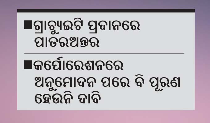 ରାଜ୍ୟ ସରକାରଙ୍କ ଓଡ଼ିଶା ସିଭିଲ ସର୍ଭିସ ଆକ୍ଟ ୨୦୧୬ ସେକ୍ସନ ୧୮ ଅନୁଯାୟୀ, ମ୍ୟୁନିସିପାଲ କର୍ମଚାରୀମାନେ ସରକାରୀ କର୍ମଚାରୀଙ୍କ ପରି ସମସ୍ତ ସୁବିଧା ପାଇବେ। ମାତ୍ର ପୌର କର୍ମଚାରୀଙ୍କ କ୍ଷେତ୍ରରେ ଗ୍ରାଚ୍ୟୁଇଟି ୮ଲକ୍ଷ ଟଙ୍କା ପ୍ରଦାନ କରାଯିବ ବୋଲି ୨୦୨୦ ଜାନୁୟାରୀ ୧୬ରେ ନଗର ଉନ୍ନୟନ ବିଭାଗର ରେଜୁଲେଶନ ନଂ.୧୪୧୪ରେ ପ୍ରକାଶ ପାଇଥିଲା। ଯାହାକୁ ପୌର କର୍ମଚାରୀ ବିରୋଧ କରିବା ସହ ଏହାର ସଂଶୋଧନ ଦାବି କରୁଥିବାବେଳେ ଏନେଇ କୌଣସି ସମାଧାନ ବାହାରିପାରୁ ନାହିଁ। ଦାବି ସମ୍ପର୍କରେ ବିଏମ୍ସି ବିଭାଗୀୟ ଅଧିକାରୀଙ୍କଠାରୁ ଆରମ୍ଭ କରି ମେୟର ପର୍ଯ୍ୟନ୍ତ ସମସ୍ତଙ୍କର ଦୃଷ୍ଟି ଆକର୍ଷଣ କରାଯାଇଛି। ଏପରିକି ଗ୍ରାଚ୍ୟୁଇଟି ଟଙ୍କା ବୃଦ୍ଧି କରିବା ନିମନ୍ତେ ଜାନୁୟାରୀରେ ବସିଥିବା ବିଏମ୍ସି କର୍ପୋରେଶନ୍ ବୈଠକରେ ମଧ୍ୟ ଅନୁମୋଦିତ ହୋଇଛି। କର୍ପୋରେଟରମାନେ ଏହାକୁ ସର୍ବସମ୍ମତି କ୍ରମେ ପାସ୍ କରିଛନ୍ତି। କେବଳ ଗୃହ ଓ ନଗର ଉନ୍ନୟନ ବିଭାଗ ପକ୍ଷରୁ ଏହାକୁ ଅନୁମୋଦନ କରିବା ପରେ ବିଏମ୍ସି ତା’ ନିଜ ପାଣ୍ଠିରୁ ଗ୍ରାଚ୍ୟୁଇଟି ପ୍ରଦାନ କରିବ। ମାତ୍ର ବିଏମ୍ସି ପକ୍ଷରୁ ଇତି ମଧ୍ୟରେ ଗୃହ ଓ ନଗର ଉନ୍ନୟନ ବିଭାଗକୁ ବାରମ୍ବାର ଚିଠି କରାଯାଇଥିଲେ ବି କୌଣସି ଉତ୍ତର ମିଳୁନାହଁ। ଗୋଟେପଟେ ନଗର ଉନ୍ନୟନ ବିଭାଗ ହାତ ବାନ୍ଧି ବସିଥିବାବେଳେ ବିଏମ୍ସି ଅଧିକାରୀ ଚିଠି କରିଦେଇ ନିଜ ମୁଣ୍ଡରୁ ଦୋଷ ଖସାଇ ଦେଉଛନ୍ତି। ସେହିପରି ଅବସରପ୍ରାପ୍ତ ବିଏମ୍ସି କର୍ମଚାରୀଙ୍କୁ ପେନ୍ସନ୍ ବହି ମିଳୁନାହିଁ। ଫଳରେ ସେମାନଙ୍କୁ କେଉଁଠାରୁ ଋଣ ମିଳିପାରୁ ନାହିଁ। ରାଜ୍ୟର ଏତେବଡ଼ ପୌର ସଂସ୍ଥାରେ କାମ କରି ଏଭଳି ସମସ୍ୟା ଦେଇ ଗତି କରିବା ନିହାତି ପକ୍ଷେ ଲଜ୍ୟାର ବିଷୟ ବୋଲି ସଂଘ ସମ୍ପାଦକ ବ୍ରଜ ପଣ୍ଡା କହିଛନ୍ତି। ସେହିପରି ବିଭାଗ ପକ୍ଷରୁ ତୁରନ୍ତ ନିଷ୍ପତ୍ତି ପ୍ରକାଶ କରା ନ ଗଲେ ଆଗାମୀ ଦିନରେ ଚରମ ନିଷ୍ପତ୍ତି ନେବେ ବୋଲି ସଂଘ ପକ୍ଷରୁ ସୂଚନା ଦିଆଯାଇଛି। ବିଏମ୍ସି କର୍ପୋରେଶନରେ ପାରିତ ହୋଇଥିବା ପ୍ରସ୍ତାବର ନକଲ ସହ ଚଳିତ ମାସ ୨୧ ତାରିଖରେ ବିଭାଗକୁ ପୁଣିଥରେ ଚିଠି କରିଛି। ମାତ୍ର ଏହାସତ୍ତ୍ୱେ ବିଭାଗ ପକ୍ଷରୁ କୌଣସି ପଦକ୍ଷେପ ନିଆଯାଇ ନଥିବାରୁ ସଂଘ ଅସନ୍ତୋଷ ପ୍ରକାଶ କରିଛି।