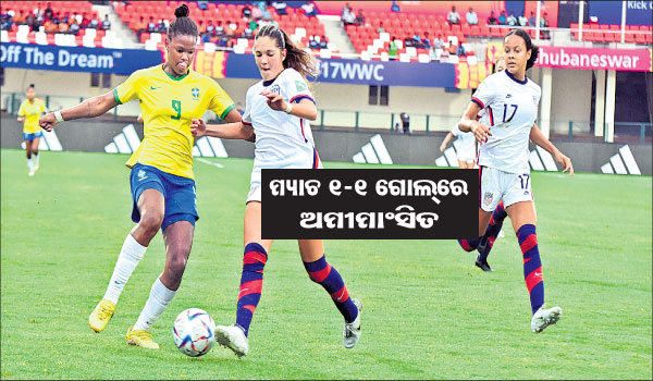 ଭୁବନେଶ୍ୱର,୧୫।୧୦ (କ୍ରୀଡ଼ା ପ୍ରତିନିଧି): କଳିଙ୍ଗ ଷ୍ଟାଡିୟମରେ ଶୁକ୍ରବାର ଅନୁଷ୍ଠିତ ୧୭ ବର୍ଷରୁ କମ୍‌ ମହିଳା ଫିଫା ବିଶ୍ୱକପ ମ୍ୟାଚରେ ବ୍ରାଜିଲ ଓ ଆମେରିକା ମଧ୍ୟରେ ହୋଇଥିଲା କଡ଼ା ଟକ୍କର। ମାତ୍ର ଦୁଇ ସମକକ୍ଷ଼ ଦଳର ମ୍ୟାଚ୍‌ରୁୁ କୌଣସି ଫଳାଫଳ ବାହାରି ପାରିଲା ନାହିଁ। ମ୍ୟାଚ୍‌ଟି ୧-୧ ଗୋଲ୍‌ରେ ଡ୍ର ଭାବେ ଶେଷ ହେଲା। ଆମେରିକାର ନିକୋଲେଟ୍‌ କିଓର୍ପସ ଏବଂ ବ୍ରାଜିଲର କାରୋଲ ଗୋଟିଏ ଲେଖାଏ ଗୋଲ ଦେଇଥିଲେ। ମ୍ୟାଚ୍‌ ଡ୍ର ରହିବା ଫଳରେ ଉଭୟ ଦଳ ଗୋଟିଏ ଲେଖାଏ ପଏଣ୍ଟ ପାଇଛନ୍ତି। ଫଳରେ ଉଭୟ ଦଳର ପଏଣ୍ଟ ସଂଖ୍ୟା ୪ରେ ପହଞ୍ଚତ୍ଛି। ବ୍ରାଜିଲ ୪-୫-୧ ଓ ଆମେରିକା ୪-୩-୩ ଷ୍ଟାର୍ଟିଂ ଲାଇନ୍‌ଅପ୍‌ ନେଇ ଖେଳିଥିଲା। ପୂରା ମ୍ୟାଚରେ ଦେଖିବାକୁ ଗଲେ ବଲ୍‌ ୪୧ ପ୍ରତିଶତ ବ୍ରାଜିଲ ଏବଂ ୫୮ ପ୍ରତିଶତ ଆମେରିିକା ନିୟନ୍ତ୍ରଣରେ ରହିଥିଲା। ବ୍ରାଜିଲ ୧୪ଟି ଶଟ୍‌ ଟାର୍ଗେଟ କରିଥିବାବେଳେ ଆମେରିକାର ଏହି ସଂଖ୍ୟା ଥିଲା ୧୯। ବ୍ରାଜିଲ କୌଣସି କର୍ନର ପାଇ ନ ଥିବାବେଳେ ଆମେରିକା ୭ଟି କର୍ନର ପାଇଥିଲା। ଆକ୍ରମଣାତ୍ମକ ଆଭିିମୁଖ୍ୟ ଦୃଷ୍ଟିରୁ ଆଗରେ ରହିଥିଲା ଆମେରିକା। ଏହି ସଂଖ୍ୟା ବ୍ରାଜିଲର ୨୧ ଓ ଆମେରିକାର ୩୬ ପ୍ରତିଶତ ରହିଥିଲା। ବ୍ରାଜିଲ ଗୋଲକିପର ଲେଲାନେ ପ୍ଲେୟର ଅଫ୍‌ ଦି ମ୍ୟାଚ ବିବେଚିତ ହୋଇଥିଲେ।