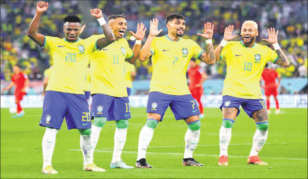 ଦୋହା,୭।୧୨(ପି.ଟି.): କ୍ୱାର୍ଟର ଫାଇନାଲ ପ୍ରବେଶ ପରେ ବ୍ରାଜିଲ ଦଳର ଖେଳାଳି ମାନେ ନାଚିଥିଲେ। ଟୁର୍ନାମେଣ୍ଟ ପୂର୍ବରୁ ପ୍ରତି ଗୋଲ ପାଇଁ ଭିନ୍ନ ସେଲିବ୍ରେଶନର ପ୍ରତିଶ୍ରୁତି ଦେଇଥିବା ବ୍ରାଜିଲ ଦଳ ଏହାକୁ ପାଳନ କରି ଆସିଛି। ଦକ୍ଷିଣ କୋରିଆ ବିପକ୍ଷ ବୃହତ ବିଜୟ ପରେ ବ୍ରାଜିଲ ଦଳ ଏକାଠି ନାଚିଥିବା ବେଳେ କୋଚ ଟିଟେ ମଧ୍ୟ ଏଥିରେ ସାମିଲ ହୋଇଥିଲେ। ବ୍ରାଜିଲ ପକ୍ଷରୁ ଭିନିସିଅସ୍ ଜୁନିୟର, ନେମାର, ରିଚାର୍ଲିସନ ଓ ଲୁକାସ୍ ପାକ୍ୱେଟା ଗୋଟିଏ ଲେଖାଏ ଗୋଲ ସ୍କୋର କରିଥିଲେ। ଏହା ସହ ପ୍ରତି ଗୋଲ ପାଇଁ ବ୍ରାଜିଲ ଦଳ ପକ୍ଷରୁ ଭିନ୍ନ ଭିନ୍ନ ଡ୍ୟାନ୍ସ ମୁଭ୍ ପ୍ରଦର୍ଶନ କରାଯାଇଥିଲା। ମ୍ୟାଚ ସମୟରେ ଭିନିସିଅସ୍ ଜୁନିୟର, ନେମାର, ରିଚାର୍ଲିସନ ଓ ଲୁକାସ୍ ପାକ୍ୱେଟା ଭିନ୍ନ ଭିନ୍ନ ସମୟରେ ସେଲିବ୍ରେଶନ ଡ୍ୟାନ୍ସ କରିଥିବା ବେଳେ ରିଚାର୍ଲିସନଙ୍କ ସହିତ ଟିଟେ ‘ପିଜନ୍’ ସେଲିବ୍ରେଶନ୍ କରିଥିଲେ। ମ୍ୟାଚ ଶେଷ ହେବା ପରେ ବ୍ରାଜିଲ କିମ୍ବଦନ୍ତୀ ରୋନାଲ୍ଡୋଙ୍କୁ ଡ୍ୟାନ୍ସ ମୁଭ୍ ଶିଖାଇଥିଲେ କୋଚ୍ ଟିଟେ। ତେବେ ବ୍ରାଜିଲର ଏହି ଡ୍ୟାନ୍ସ ସେଲିବ୍ରେଶନକୁ ଆୟର୍ଲାଣ୍ଡ ଫୁଟବଲ ଓ କିଛି ଭାଷ୍ୟକାରଙ୍କ ପକ୍ଷରୁ ସମାଲୋଚନା କରାଯାଇଥିଲା।