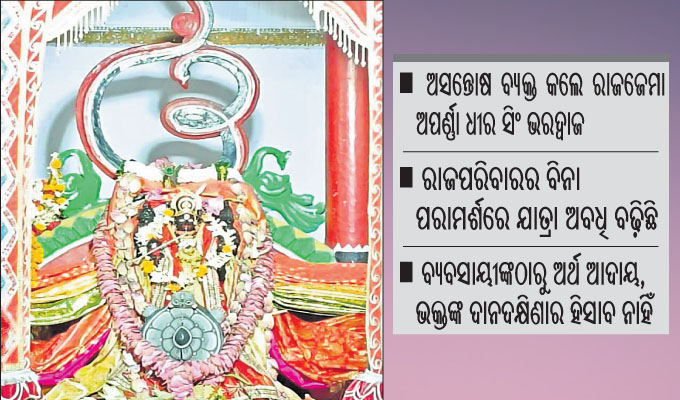 ମାତ୍ର ସ୍ଥାନୀୟ ଅଞ୍ଚଳର କେତେଜଣ ବ୍ୟକ୍ତିଙ୍କ ଅନଧିକାର ପ୍ରବେଶ ପୂଜାରେ ବିଶୃଙ୍ଖଳା ସୃଷ୍ଟି କରୁଛି। ଐତିହାସିକ ପରମ୍ପରା ଭାଙ୍ଗିବା ଭଳି ସ୍ଥିତି ଉପୁଜୁଛି। କିଛି ବର୍ଷ ହେବ ଏହିଭଳି ସ୍ଥିତି ଉପୁଜୁଥିବା ଲକ୍ଷ୍ୟ କରାଯାଉଛି। ରାଜପରିବାରର ବିନା ପରାମର୍ଶରେ ସଫେଇ ଆଳରେ ପୁଷ୍କରିଣୀ ଶୁଖାଇ ଦିଆଯାଉଛି। ଜଳାଶୟସ୍ଥିତ ମନ୍ଦିର ଉପରେ ବୋଟ୍‌ ଚାଳନା କରାଯାଉଛି। ପୁଷ୍କରିଣୀ ପାଣିରେ ଆତସବାଜି ହେଉଛି। ପ୍ରଭୁଙ୍କୁ ପାଣିରୁ ଉଠାଇବା ସମୟରେ ଅଣସେବାୟତ ସାମିଲ ହେଉଛନ୍ତି ଓ ଠାକୁରଙ୍କୁ ପହଣ୍ଡି ବିଜେରେ କେବଳ ରାଜପରିବାର ପକ୍ଷରୁ ପୁଷ୍ପାଞ୍ଜଳି ଦିଆଯିବା ପ୍ରଥାକୁ ଭାଙ୍ଗି ଦିଆଯାଇଛି। ଶ୍ରଦ୍ଧାଳୁମାନେ ପହଣ୍ଡି ବିଜେ ଯାତ୍ରାରେ ସାମିଲ ହୋଇ ପୁଷ୍ପାଞ୍ଜଳି ପ୍ରଦାନ କରୁଛନ୍ତି। ବିନା ପରାମର୍ଶରେ ଯାତ୍ରାର ଅବଧିକୁ ବଢ଼ାଇ ଦିଆଯାଉଛି। ବ୍ୟବସାୟୀଙ୍କଠାରୁ ବିଭିନ୍ନ ଆଳରେ ଅର୍ଥ ଆଦାୟ କରାଯାଉଛି। ମାଳି ସେବାୟତଙ୍କୁ ଅଧିକାରରୁ ବଞ୍ଚତ୍ତ କରି ଯାତ୍ରା କମିଟି ପକ୍ଷରୁ ଫୁଲ ଦୋକାନକୁ ନିଲାମ ଦିଆଯାଉଛି ଓ ଭୋଗ, ଦୀପ ଦୋକାନ ଆଦିକୁ ନିଲାମ ଦିଆଯିବା ଘଟଣାକୁ ରାଜପରିବାର ପକ୍ଷରୁ ନାପସନ୍ଦ କରାଯାଇଛି। ରାଜ ପରିବାରର ଅଗୋଚରରେ ଏଭଳି ସମସ୍ତ ଆଚରଣ ଯାତ୍ରାର ଐତିହାସିକ ପରିମ୍ପରାକୁ ଭାଙ୍ଗୁଛି। ଭକ୍ତ ଓ ଶ୍ରଦ୍ଧାଳୁଙ୍କ ପାଇଁ ଉଦ୍ଦିଷ୍ଟ ଯାତ୍ରାରେ ବ୍ୟବସାୟିକ ମନୋବୃତ୍ତି ପରମ୍ପରା ଓ ଐତିହ୍ୟକୁ କଳଙ୍କିତ କରୁଛି। ଆଗକୁ ଏସବୁ ବନ୍ଦ କରାଯିବ। ଯାତ୍ରା ସମୟରେ ବେଆଇନ ଅର୍ଥ ଆଦାୟ ଉପରେ ଅଙ୍କୁଶ ଲଗାଇବା ଓ ଅନ୍ୟାନ୍ୟ ସମସ୍ତ ବେଆଇନ କାର୍ଯ୍ୟକୁ ବନ୍ଦ କରିବା ଉପରେ ଗୁରୁତ୍ୱ ଦିଆଯିବ। ଏ ଦିଗରେ ଯାଜପୁର ଜିଲା ପ୍ରଶାସନ ସହ ଆଲୋଚନାକରି ନିଷ୍ପତ୍ତି ନିଆଯିବ। ପ୍ରଶାସନ ପକ୍ଷରୁ ସହଯୋଗ ନ ମିଳିଲେ ରାଜଜେମା କୋର୍ଟର ଦ୍ୱାରସ୍ଥ ହେବେ ବୋଲି ଶୁଣାଇଛନ୍ତି। ଚଳିତବର୍ଷ ଯାତ୍ରାରେ ଘଟିଥିବା ଅଘଟଣ, ଭାଙ୍ଗିଥିବା ପରମ୍ପରା ସମ୍ପର୍କରେ ସେ ଯାଜପୁର ଜିଲାପାଳ ଓ ଏସ୍‌ପିଙ୍କ ସହ ଆଲୋଚନା କରିବେ ବୋଲି ପ୍ରକାଶ କରିଛନ୍ତି।