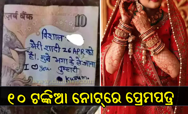 ଦଶ ଟଙ୍କିଆ ନୋଟ୍ରେ ପ୍ରେମପତ୍ର। ବିବାହକୁ ନେଇ ଖୁସି ନ ଥିବା ପ୍ରେମିକା ନିଜର ପ୍ରେମିକଙ୍କୁ ବିବାହ ମଣ୍ଡପରୁ ଉଠାଇ ନେବାକୁ ପତ୍ରରେ କହିଛନ୍ତି। ଏଥିପାଇଁ ସେ ନୋଟ୍ରେ ନିଜର ମନକଥା ଲେଖି ପଠାଇଛନ୍ତି। ପ୍ରେମ ସପ୍ତାହରେ ସୋସିଆଲ ମିଡିଆରେ ଏଭଳି ଏକ ପତ୍ର ବେଶ ଭାଇରାଲ ହେଉଛି।