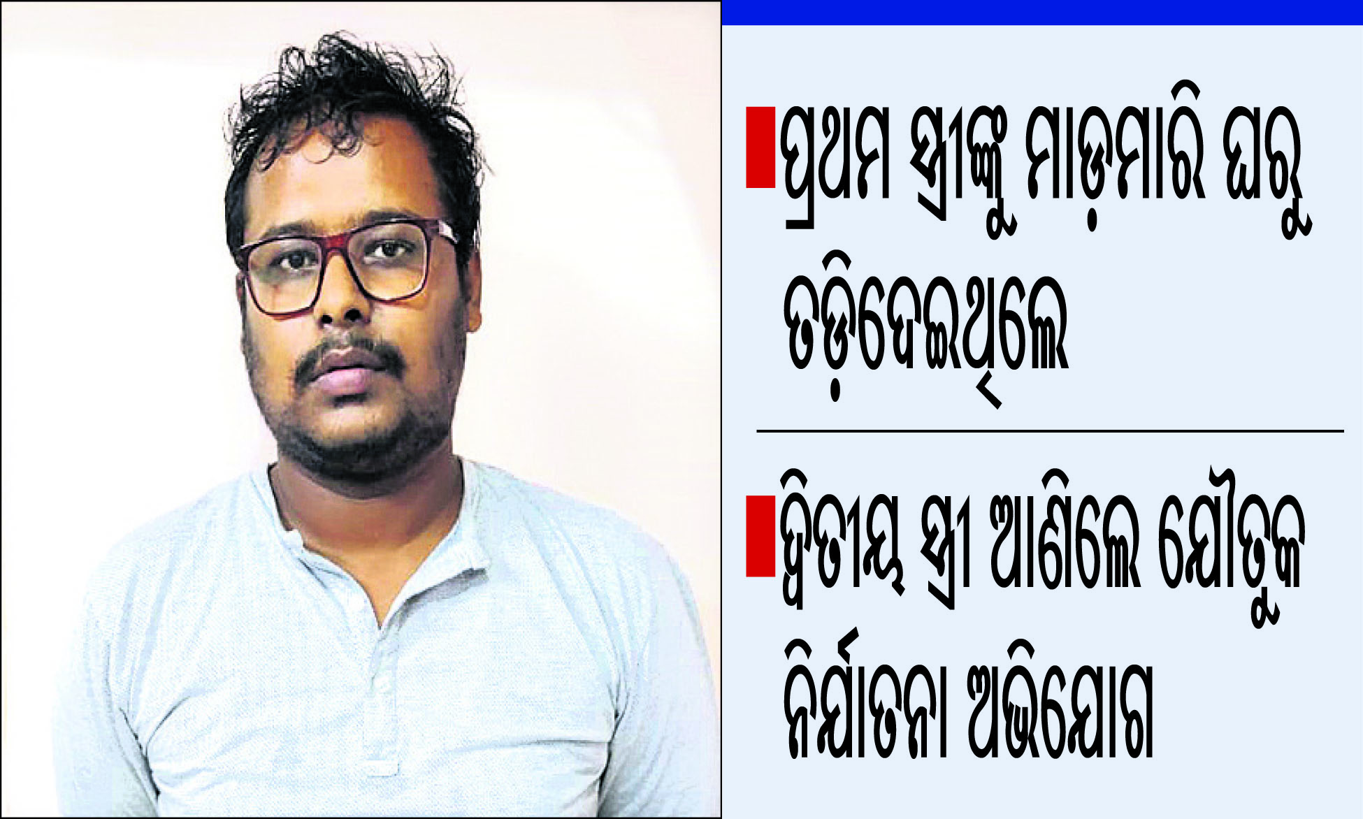 ଭୁବନେଶ୍ୱର,୯।୭(ବ୍ୟୁରୋ):ଯୌତୁକ ସାମଗ୍ରୀ ହାତେଇବା ପରେ ପ୍ରଥମ ସ୍ତ୍ରୀଙ୍କୁ ମାଡ଼ ମାରି ଘରୁ ତଡ଼ି ଦେଇଥିଲେ। ଏବେ ଦ୍ୱିତୀୟ ସ୍ତ୍ରୀ ଆଣିଛନ୍ତି ସମାନ ଅଭିଯୋଗ। ତାଙ୍କ ଅଭିଯୋଗ ଆଧାରରେ କ୍ୟାପିଟାଲ ଥାନା ପୋଲିସ ଗୁରୁବାର ଅଭିଯୁକ୍ତ ସ୍ବାମୀ ତଥା ବିଲ୍ଡର ସୂର୍ଯ୍ୟନଗରରେ ରହୁଥିବା ପୁରୀ ଜିଲା ଚନ୍ଦନପୁର ଅଞ୍ଚଳର ପ୍ରିୟବ୍ରତ ମିଶ୍ର (୨୮)ଙ୍କୁ ଗିରଫ କରିଛି। ଜାମିନ ନାମଞ୍ଜୁର ହେବାରୁ ତାଙ୍କୁ ବିଚାର ବିଭାଗୀୟ ହାଜତକୁ ପଠାଇ ଦିଆଯାଇଛି। ଅନ୍ୟପକ୍ଷରେ ଏହି ମାମଲାରେ ସମ୍ପୃକ୍ତ ଥିବା ଅଭିଯୁକ୍ତଙ୍କ ମା’ବାପା କୋର୍ଟରୁ ଆଗୁଆ ଜାମିନ ପାଇଥିବା ପୋଲିସ କହିଛି।