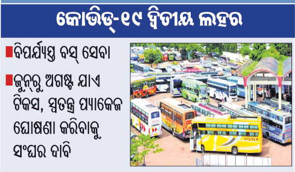 କୋଭିଡ୍‌ ପ୍ରଥମ ଲହର ପରେ ବସ୍‌ ସେବା ସ୍ବାଭାବିକ ହେବା ପୂର୍ବରୁ ଦ୍ୱିତୀୟ ଲହରର ଶକ୍ତ ଧକ୍କା ଦେଇଛି। ରାଜ୍ୟର ଆର୍ଥିକ ଓ ନିଯୁକ୍ତି କ୍ଷେତ୍ରକୁ ଗୁରୁତ୍ୱ ଦେଇ ରାଜ୍ୟ ଓ କେନ୍ଦ୍ର ସରକାର ସ୍ବତନ୍ତ୍ର ଭାବେ ରାଜ୍ୟ ପରିବହନ ଶିଳ୍ପକୁ ଗୁରୁତ୍ୱ ଦେବାକୁ ସଂଘ ପକ୍ଷରୁ ନିବେଦନ କରାଯାଇଛି। ବାସ୍ତବ ସ୍ଥିତିକୁ ଅନୁଧ୍ୟାନ କରି ପରିବହନ ଶିଳ୍ପକୁ ବଞ୍ଚାଇବା ପାଇଁ କେନ୍ଦ୍ର ଅର୍ଥମନ୍ତ୍ରୀ, ପ୍ରଧାନମନ୍ତ୍ରୀ ଓ ରାଜ୍ୟ ମୁଖ୍ୟମନ୍ତ୍ରୀ ତୁରନ୍ତ ପଦକ୍ଷେପ ନେବାକୁ ସଂଘ ନିବେଦନ କରିଛି। ରାଜ୍ୟ ସରକାର ମୋଟର ଯାନ ଟିକସ ଛାଡ଼ କରିଛନ୍ତି। କରୋନା ସ୍ଥିତି କେତେବେଳେ ସ୍ବାଭାବିକ ହେବ ତାହା ଅନିଶ୍ଚିତତା ମଧ୍ୟରେ ଗତି କରୁଛି। ଏହାକୁ ଦୃଷ୍ଟିରେ ରଖି ବସ୍‌ ମାଲିକମାନେ ସମସ୍ତ ବସ୍‌କୁ ଅନିର୍ଦ୍ଦିଷ୍ଟ କାଳ ପାଇଁ ବନ୍ଦ କରିଛନ୍ତି ବୋଲି ସଂଘ ମୁଖପାତ୍ର ଦେବାଶିଷ ନାୟକ କହିଛନ୍ତି। ଲକ୍‌ଡାଉନ ଉଠିବା ପରେ ବସ୍‌ଗୁଡ଼ିକରେ ଆବଶ୍ୟକ ସଂଖ୍ୟକ ଯାତ୍ରୀ ହେବେ କି ନାହିଁ ତାହା ଆଶଙ୍କା ଭିତରେ ରହିଛି। ଏଥିସହିତ କ୍ରମାଗତ ଡିଜେଲ ଦର ବୃଦ୍ଧି ବୋଝ ଉପରେ ନଳିତବିଡ଼ା ହୋଇଛି। ବସ୍‌ ଚଳାଚଳ ଜାରି ରଖିଲେ ଦୈନିକ ୧୦ ହଜାର ଟଙ୍କା କ୍ଷତି ହେବାର ସମ୍ଭାବନା ରହିଛି। ଏସବୁକୁ ଦୃଷ୍ଟିରେ ରଖି ଚଳିତ ଜୁନ୍‌ରୁ ଅଗଷ୍ଟ ଯାଏ ଟିକସ ଛାଡ଼ କରିବା ସହ ବ୍ୟାଙ୍କ ସୁଧ ୬ ମାସ ପାଇଁ ସ୍ଥଗିତ ରଖିବା, ବସ୍‌ର ବୀମା ଅବଧିକୁ ୬ ମାସ ପାଇଁ ବୃଦ୍ଧି କରିବା, ବସ୍‌ ମାଲିକ ଓ କର୍ମଚାରୀମାନଙ୍କ ପାଇଁ ସ୍ବତନ୍ତ୍ର ଆର୍ଥିକ ପ୍ୟାକେଜ ଘୋଷଣା କରିବାକୁ ସଂଘ ପକ୍ଷରୁ ଦାବି କରାଯାଇଛି।