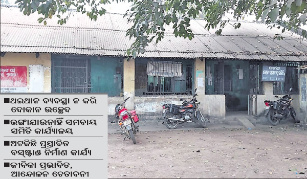 ସେବା ସମବାୟ ସମିତି କାର୍ଯ୍ୟାଳୟ ଉଚ୍ଛେଦ କରା ନ ଯାଇ ତରବରିଆ ଭାବେ ଦୋକାନ ଘରଗୁଡ଼ିକ ପ୍ରଶାସନ ଭାଙ୍ଗିଦେଲା। ବ୍ୟବସାୟୀମାନେ ବିପୁଳ କ୍ଷତି ସହୁଛନ୍ତି। ଏହାକୁ ବର୍ଷେ ବିତିଯାଇଥିଲେ ମଧ୍ୟ ବସ୍ଷ୍ଟାଣ୍ଡ ନିର୍ମାଣ କାର୍ଯ୍ୟ ଆରମ୍ଭ ନ ହେବା ପରିତାପର ବିଷୟ।