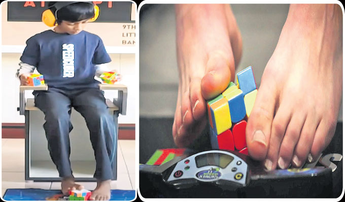 ର୍ୟୁବିକ୍ କ୍ୟୁବ୍ ସମାଧାନ କରିବା କେତେ କଷ୍ଟ ସମସ୍ତେ ଜାଣନ୍ତି। ହେଲେ କେତେଜଣ ଥାଆନ୍ତି ଯେଉଁମାନେ ବେଶ୍ ସରଳତାର ସହ ଏହାକୁ ସମାଧାନ କରିପାରନ୍ତି। ତେବେ ସମାନେ କେବଳ ହାତ ସାହାଯ୍ୟରେ ସମାଧାନ କରୁଥିବା ଦେଖିଥିବେ। ହେଲେ ବାଙ୍ଗାଲୁରର ୮ ବର୍ଷୀୟ ବାଳକ ଆର୍ଥବ ଆର୍ ଭଟ୍ଟ ଏକା ସମୟରେ ଉଭୟ ହାତ ଓ ପାଦରେ ଦୁଇଟି କ୍ୟୁବ୍ ସମାଧାନ କରିପାରନ୍ତି। ଏଭଳି କାରନାମା କରି ସେ ଗିନିଜ ଓ୍ବାର୍ଲଡ ରେକର୍ଡସ୍ରେ ବି ସ୍ଥାନ ପାଇପାରିଛନ୍ତି। ଆର୍ଥବ ଦେଢ ମିନିଟରେ ତିନୋଟି କ୍ୟୁବ୍ ସମାଧାନ କରି ଉକ୍ତ ରେକର୍ଡ କରିଛନ୍ତି। ହାତ ସାହାଯ୍ୟରେ ଏତିକି ସମୟରେ କ୍ୟୁବ୍ ସମାଧାନ କରିବା ଅନେକଙ୍କୁ ଅସମ୍ଭବ ମନେହୋଇଥାଏ। କିନ୍ତୁ ଆର୍ଥବ ଏହାକୁ ଏକାସାଙ୍ଗରେ ଉଭୟ ହାତ ଓ ପାଦରେ କରି ସମସ୍ତଙ୍କୁ ଚକିତ କରିଦେଇଛନ୍ତି।