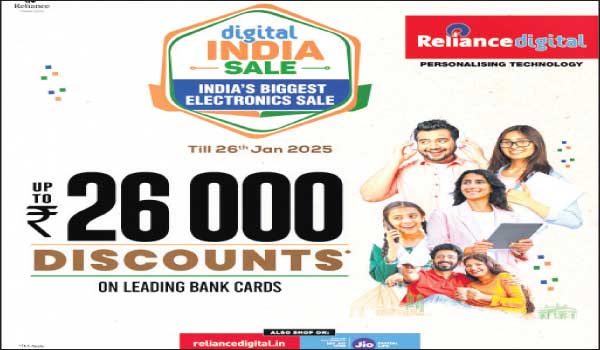 ମୁମ୍ବାଇ,୨୪।୧: ରିଲାଏନ୍ସ ଡିଜିଟାଲର ବହୁ ପ୍ରତୀକ୍ଷିତ ତଥା ଭାରତର ସବୁଠୁ ବଡ଼ ଇଲେକ୍ଟ୍ରୋନିକ୍ସ ସେଲ୍ ‘ଡିଜିଟାଲ୍ ଇଣ୍ଡିଆ ସେଲ୍’ର ଶୁଭାରମ୍ଭ ନିକଟରେ ହୋଇଯାଇଛି। ଏହି ସେଲ୍ ୨୦୨୫ ଜାନୁୟାରୀ ୨୬ ପର୍ଯ୍ୟନ୍ତ ସମସ୍ତ ରିଲାଏନ୍ସ ଡିଜିଟାଲ୍, ମାଇଁ ଜିଓ ଷ୍ଟୋର ଏବଂ...