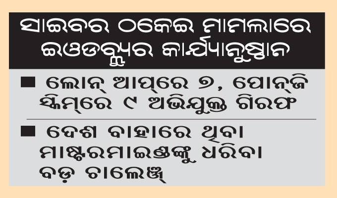 ଭୁବନେଶ୍ୱର,୧୭।୭(ସତ୍ୟଜିତ୍ ରାଉତ): ରାଜ୍ୟରେ ଠକେଇ ମାମଲା ବଢ଼ି ଚାଲିଛି। ବିଶେଷକରି ସାଇବର ଠକମାନେ ସବୁଠୁ ଅଧିକ ସକ୍ରିୟ ହୋଇ ଉଠିଛନ୍ତି। ବିଭିନ୍ନ କୌଶଳ ଆପଣାଇ କୋଟି କୋଟି ଟଙ୍କା ଠକି ନେଉଛନ୍ତି। ଚାକିରି ଠକେଇ, ଅନ୍ଲାଇନ୍ ପୋନ୍ଜି ସ୍କିମ୍, ଚାଇନା...