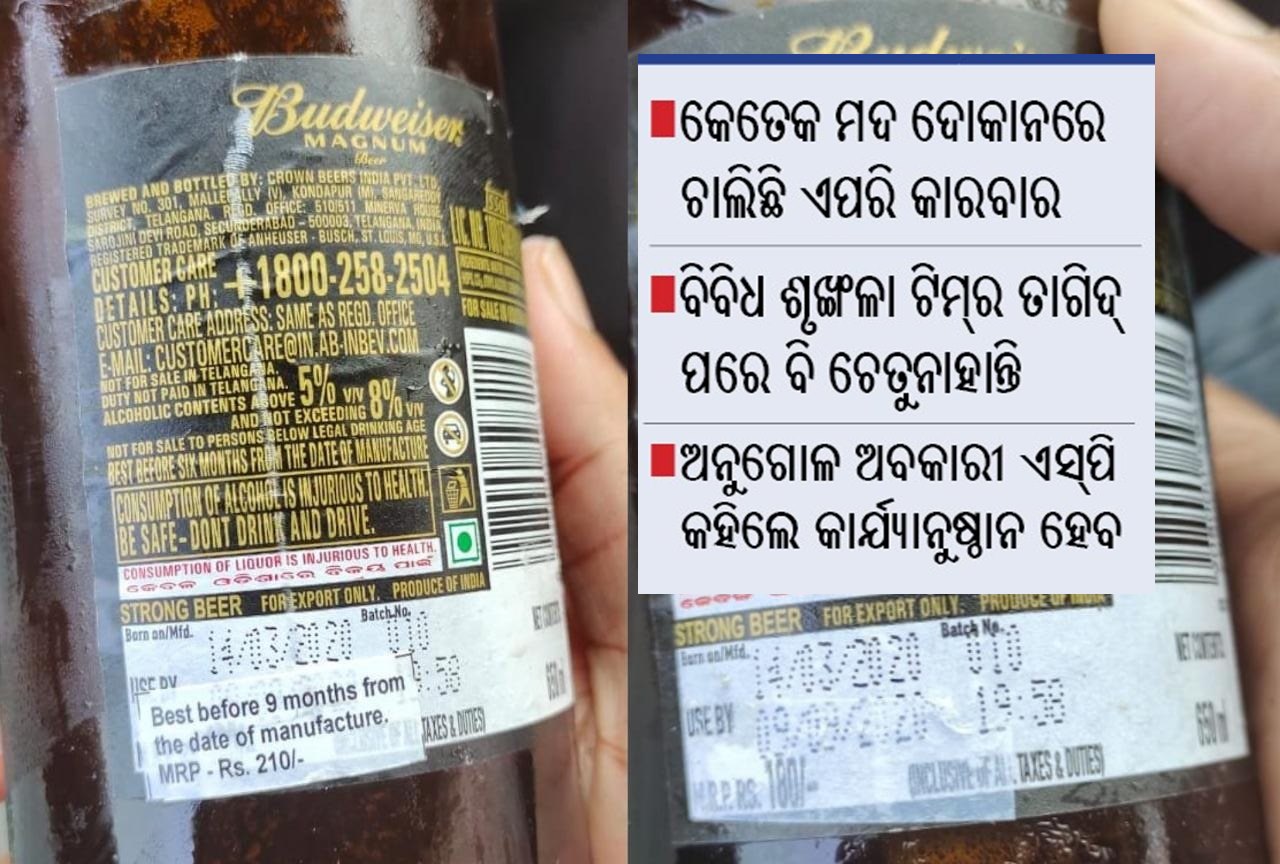 ଅନୁଗୋଳ ଅଫିସ, ୪।୨: ଅନୁଗୋଳ ଜିଲାର କେତୋଟି ମଦ କାଉଣ୍ଟରରେ ବିକ୍ରି ହେଉଛି ଏକ୍ସପାଏରୀ ମଦ। କେଇମାସ ପୂର୍ବରୁ ଅବଧି ଶେଷ ହୋଇଯାଇଥିଲେ ମଧ୍ୟ ବୋତଲରେ ନୂଆ ଷ୍ଟିକର ଲଗାଇ ବିକ୍ରି କରାଯାଉଛି। ଏପରି କି ପ୍ରିଣ୍ଟ ମୂଲ୍ୟଠାରୁ କିଛି ଟଙ୍କା...