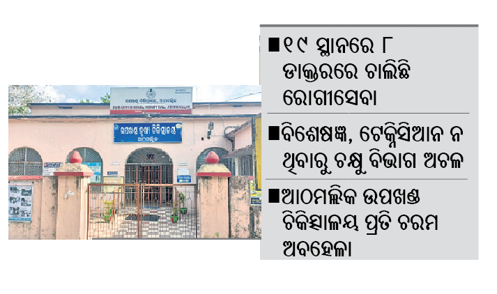 ଆଠମଲ୍ଲିକ,୧୨।୫: ଅନୁଗୋଳ ଜିଲା ଆଠମଲ୍ଲିକ ଉପଖଣ୍ଡ ମୁଖ୍ୟ ଚିକିତ୍ସାଳୟ ପ୍ରତି ସରକାରଙ୍କ ଚରମ ଅବହେଳା ନେଇ ଅସନ୍ତୋଷ ବଢ଼ିବାରେ ଲାଗିଛି। ଦୀର୍ଘଦିନ ହେଲା ଏହି ଡାକ୍ତରଖାନାରେ ମଞ୍ଜୁରୀପ୍ରାପ୍ତ ଡାକ୍ତର ପଦବୀ ମଧ୍ୟରୁ ଅଧାରୁ ଅଧିକ ଖାଲି ପଡ଼ିଛି। ଏପରି କି...