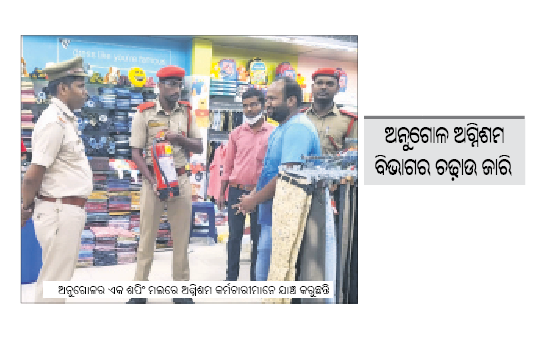 ଅନୁଗୋଳ ଅଫିସ,୯।୫: ଅନୁଗୋଳ ଜିଲା ଅଗ୍ନିଶମ ଅଧିକାରୀଙ୍କ ନେତୃତ୍ୱରେ ଏକ ଦଳ ରବିବାର ସହରରେ ଥିବା ବିଭିନ୍ନ ଶପିଂ ମଲ୍ରେ ଅଗ୍ନି ନିରାପତ୍ତା ଏବଂ ନିରାପତ୍ତା ନିୟମ ସମ୍ପର୍କରେ ଯାଞ୍ଚ କରିଛନ୍ତି। ଏହି ଦଳ ଷ୍ଟାଇଲ ବଜାର, ହୁଲୁରିସିଙ୍ଗାରେ ଥିବା ରିଲାଏନ୍ସ...