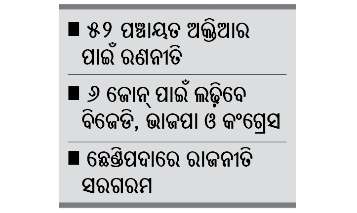 ଛେଣ୍ଡିପଦା,୧୬।୧: ପାଖେଇ ଆସିଲାଣି ପଞ୍ଚାୟତ ନିର୍ବାଚନ। ବିଜ୍ଞପ୍ତି ଅନୁଯାୟୀ ଆସନ୍ତା ୧୭ ତାରିଖରୁ ଆରମ୍ଭ ହେବ ପ୍ରାର୍ଥିପତ୍ର ଦାଖଲ। ତେଣୁ ତରବର ହୋଇ ନେତା ହୋଇଛନ୍ତି ଜନତା ମୁହାଁ। ଅନୁଗୋଳ ଜିଲା ଛେଣ୍ଡିପଦା ବିଧାନସଭା ନିର୍ବାଚନମଣ୍ଡଳୀରେ ଥିବା ମୋଟ୍ ୫୨ଟି ପଞ୍ଚାୟତ...