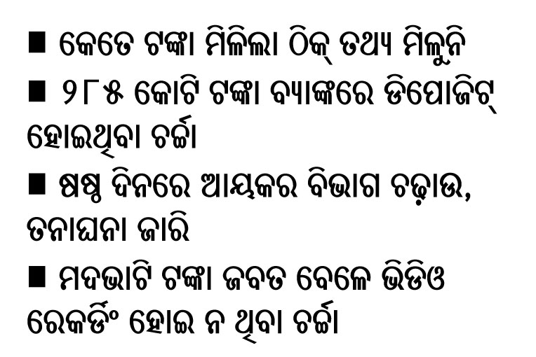 ବଲାଙ୍ଗୀର, ୧୨ା୧୨ (ବୀରେନ୍ଦ୍ର କୁମାର ଝାଙ୍କର):ବଲାଙ୍ଗୀର ଜିଲାର ବିଭିନ୍ନ ମଦଭାଟି, ମଦ ଅଫିସ ଓ ମଦ ବ୍ୟବସାୟୀଙ୍କ ବାସଭବନରେ ଚାଲିଥିବା ଆୟକର ବିଭାଗ ଚଢ଼ାଉ ସୋମବାର ଷଷ୍ଠଦିନରେ ପହଞ୍ଚତ୍ଛି। ରବିବାର ରାତି ୯ଟା ସୁଦ୍ଧା ମଦଭାଟିରୁ ଜବତ ଟଙ୍କା ଗଣତି...