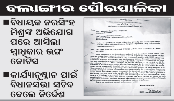 ବଲାଙ୍ଗୀର,୭ା୧୦(ବୀରେନ୍ଦ୍ର କୁମାର ଝାଙ୍କର): ସଦ୍ୟ ସମାପ୍ତ ହୋଇଥିବା ବିଧାନସଭା ଅଧିବେଶନରେ ବଲାଙ୍ଗୀର ବିଧାୟକ ନରସିଂହ ମିଶ୍ର ବଲାଙ୍ଗୀର ପୌରାଧ୍ୟକ୍ଷା ଏବଂ ପୌର ନିର୍ବାହୀ ଅଧିକାରୀ ସ୍ବାଧିକାର ଭଙ୍ଗ କରିଥିବା ନେଇ ଅଭିଯୋଗ କରିଥିଲେ। ବିଧାୟକ ମିଶ୍ରଙ୍କ ଅଭିଯୋଗକୁ ଭିତ୍ତିକରି ବଲାଙ୍ଗୀର...